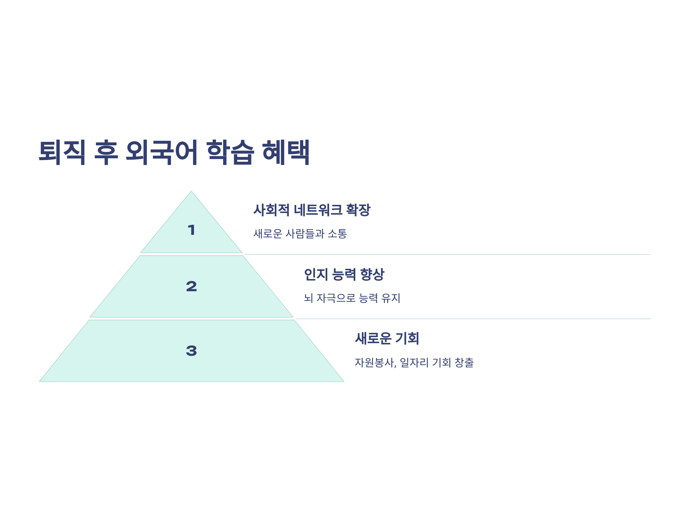 퇴직 후 외국어를 배우면 얻을 수 있는 혜택은 매우 많습니다. 첫째, 새로운 사람들과의 소통이 가능해져 사회적 네트워크가 확장됩니다. 둘째, 뇌를 자극해 인지 능력을 유지하고 향상시킬 수 있습니다. 셋째, 외국어 능력을 바탕으로 자원봉사나 일자리에서의 기회도 생길 수 있습니다.