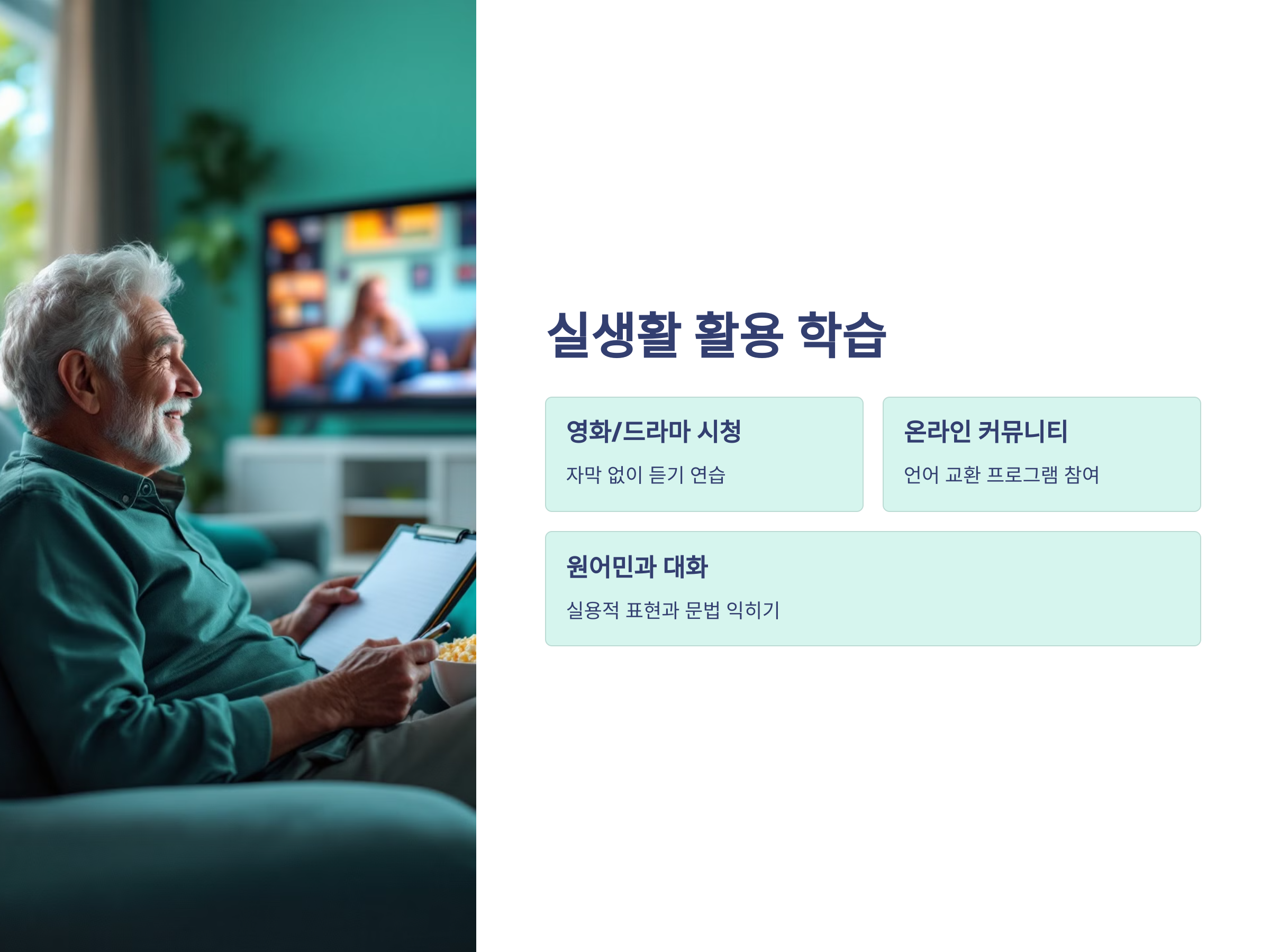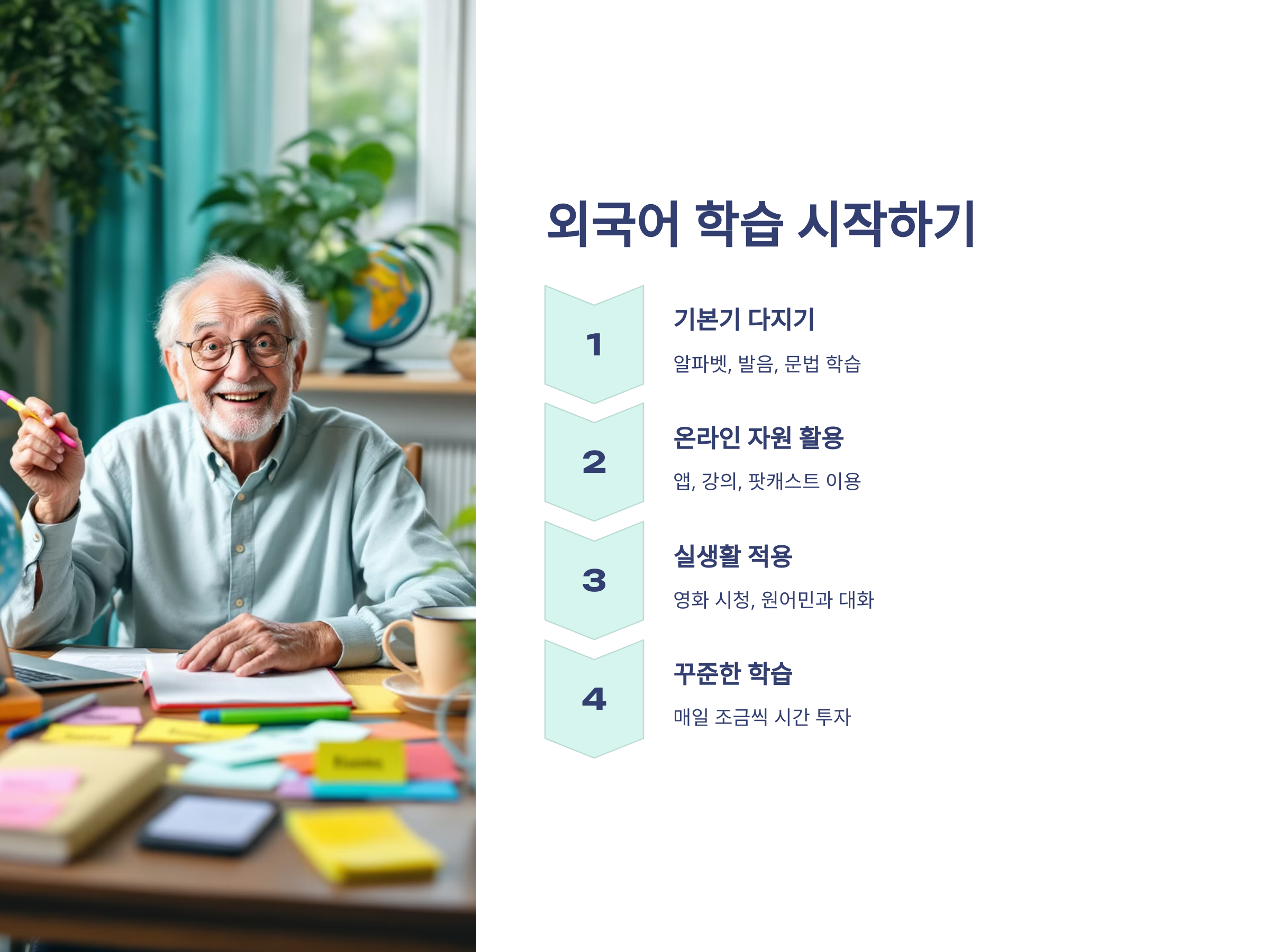 여러 번 반복해서 학습하고, 실생활에서 자주 사용할수록 점차 자신감도 붙고, 외국어를 배우는 재미도 느낄 수 있습니다. 퇴직 후에는 자기계발을 위해 새로운 도전이 필요합니다. 그 도전 중 하나가 바로 외국어 학습이 될 수 있습니다.