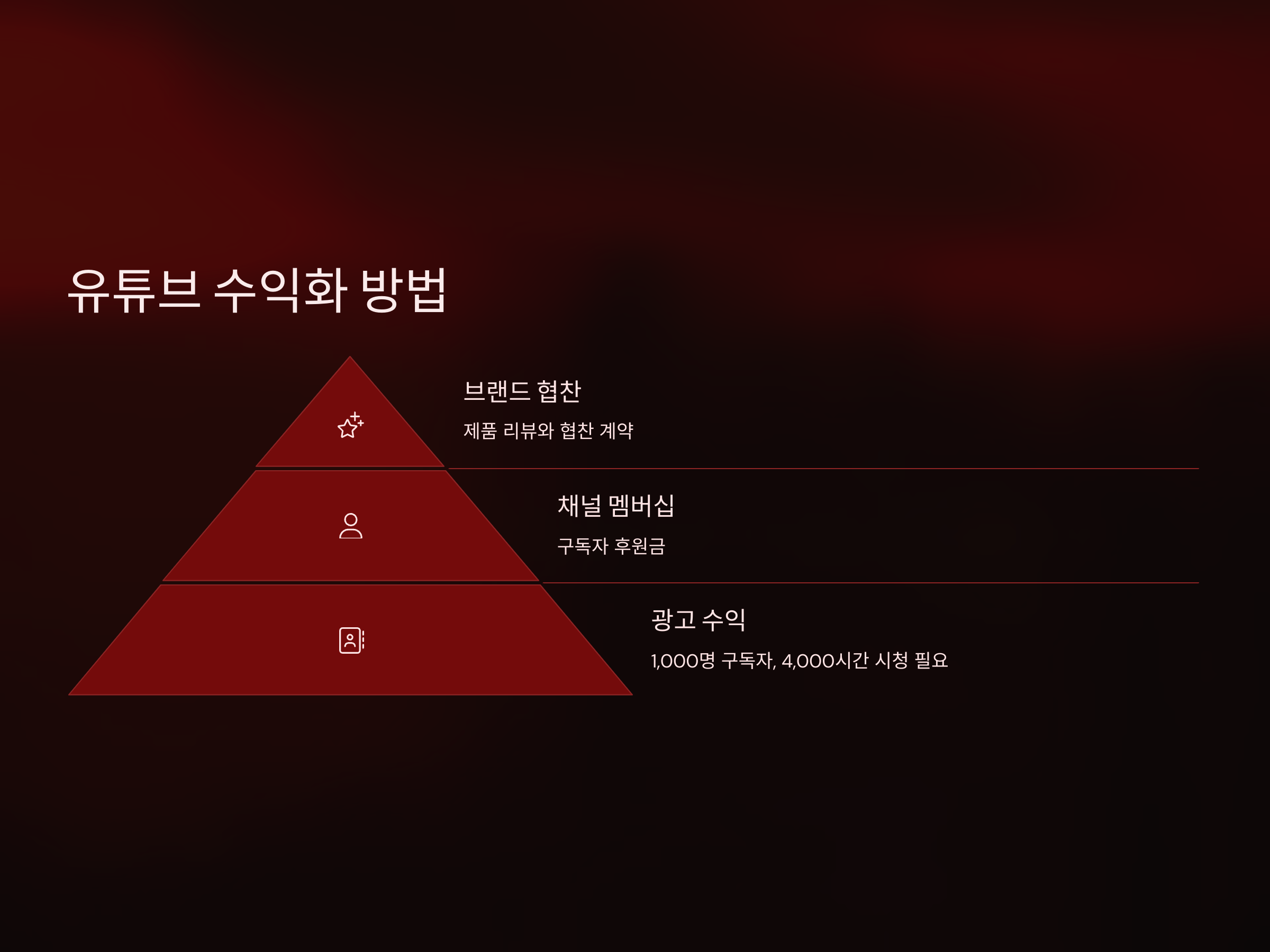 유튜브는 광고 수익을 통해 금전적인 이익을 얻을 수 있는 훌륭한 플랫폼입니다. 하지만 처음에는 수익이 미미할 수 있으므로, 이를 보완할 수 있는 방법들을 알아두는 것이 좋습니다. 퇴직 후에는 다양한 방법을 활용해 유튜브 채널을 통해 수익을 창출할 수 있습니다.