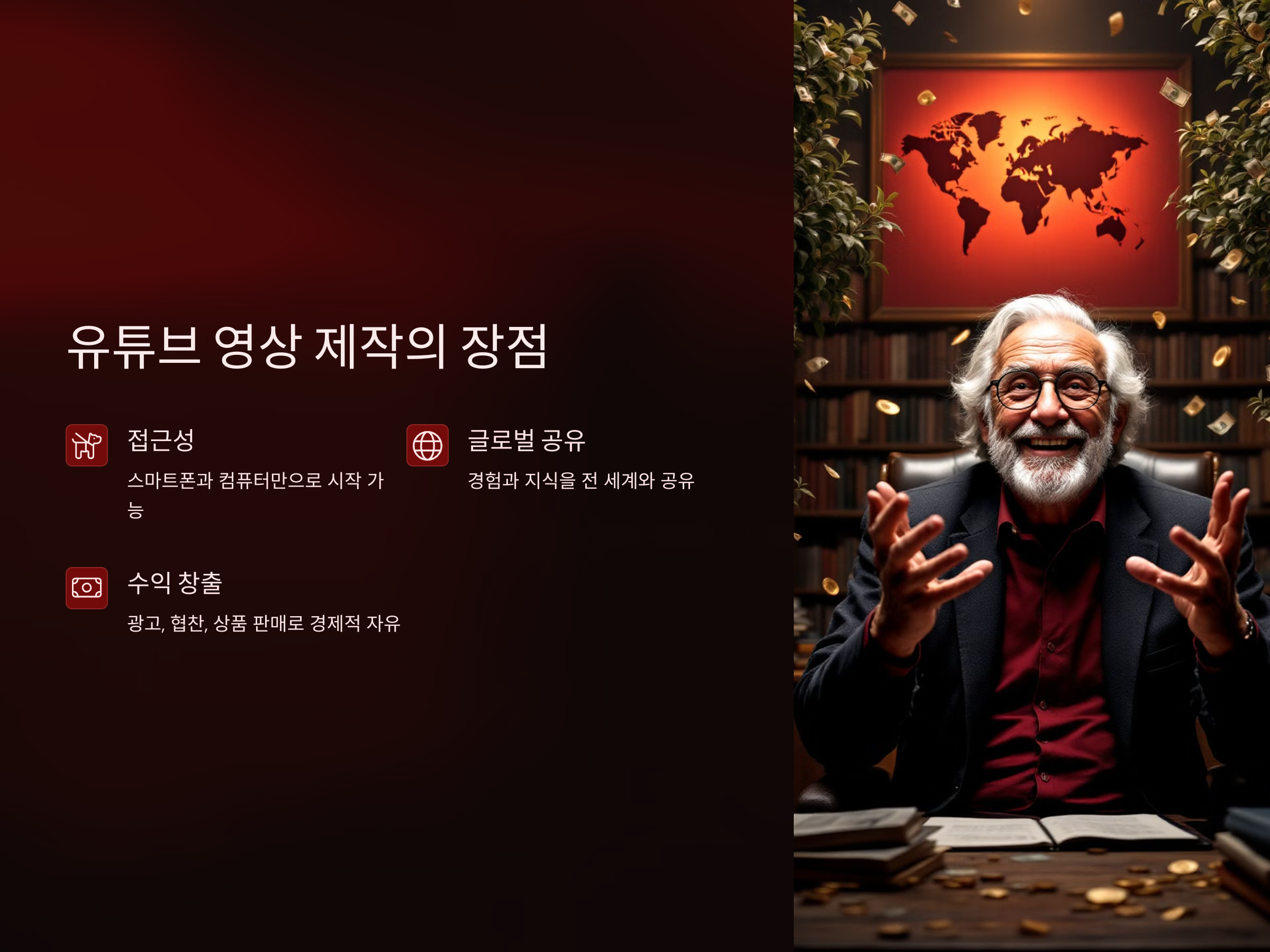 퇴직 후 유튜브 영상 제작을 시작하는 것은 여러 면에서 장점이 있습니다. 첫째, 유튜브는 누구나 쉽게 접근할 수 있는 플랫폼입니다. 스마트폰과 컴퓨터만 있으면 영상 촬영부터 편집까지, 모든 과정을 스스로 할 수 있습니다. 둘째, 유튜브를 통해 글로벌하게 콘텐츠를 공유할 수 있기 때문에, 나의 경험이나 지식을 많은 사람들과 나누는 기회를 가질 수 있습니다. 셋째, 광고 수익, 협찬, 상품 판매 등 다양한 방식으로 수익을 창출할 수 있어 경제적인 자유도 얻을 수 있습니다.