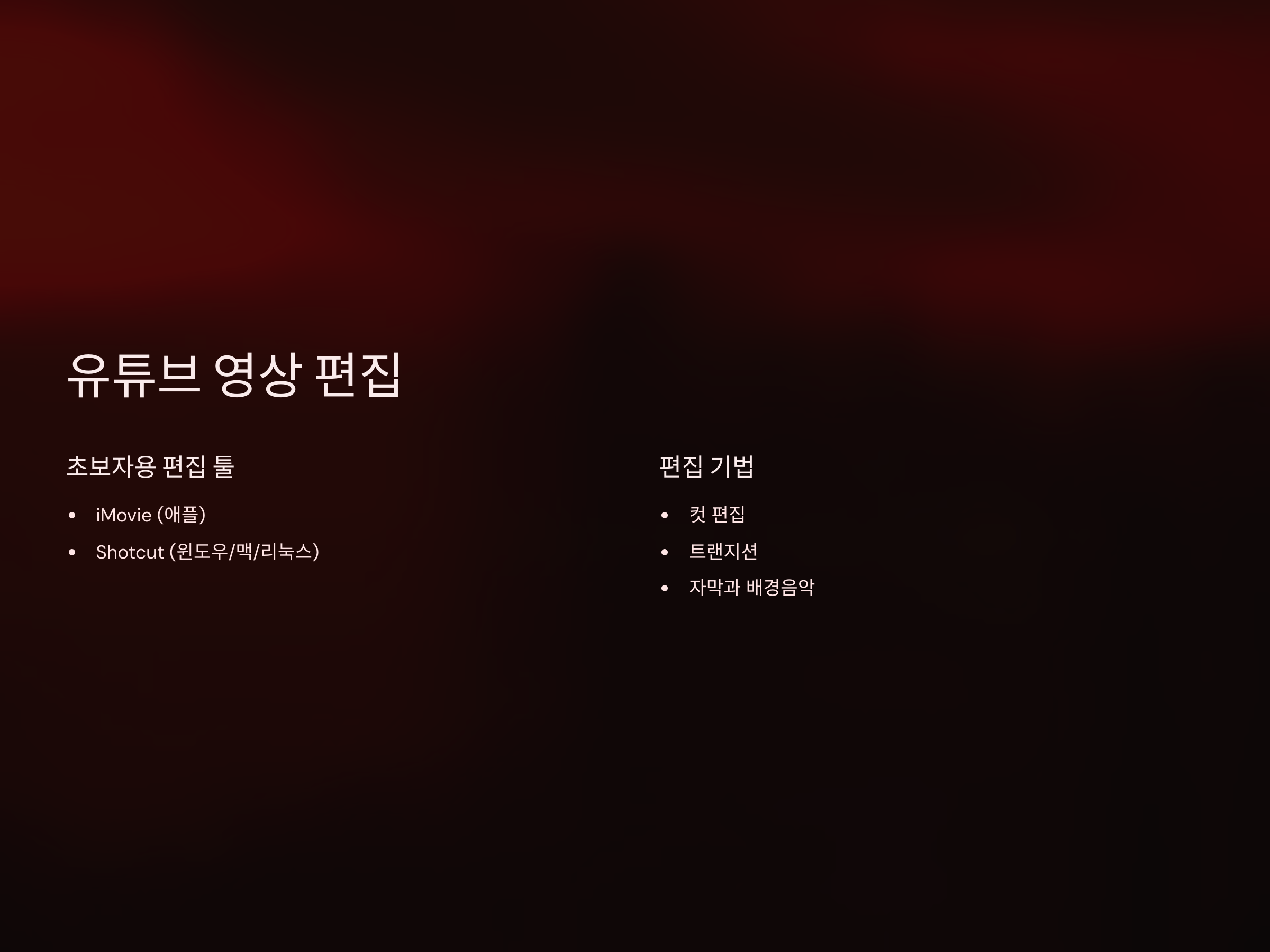 영상 편집은 영상의 완성도를 높이는 중요한 작업입니다. 퇴직 후 처음 시작하는 유튜버라면, 간단한 편집 툴부터 시작해 점차 고급 편집 기술을 배우는 것이 좋습니다. 요즘은 무료로 제공되는 영상 편집 툴도 많고, 간단한 사용법만 익히면 누구나 멋진 영상을 만들 수 있습니다.