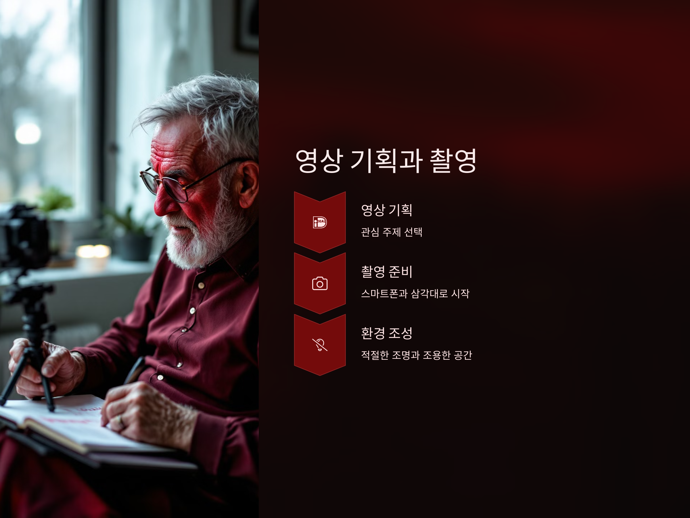 영상 기획은 콘텐츠의 핵심이 되는 단계입니다. 퇴직 후 시간이 여유롭다면, 자신이 관심 있는 주제나 취미를 바탕으로 콘텐츠를 기획할 수 있습니다. 예를 들어, 여행, 요리, 책 리뷰, 자기계발 등 다양한 주제를 다룰 수 있습니다. 중요한 점은, 자신이 잘 알고 있고, 즐길 수 있는 주제를 선택하는 것입니다.
