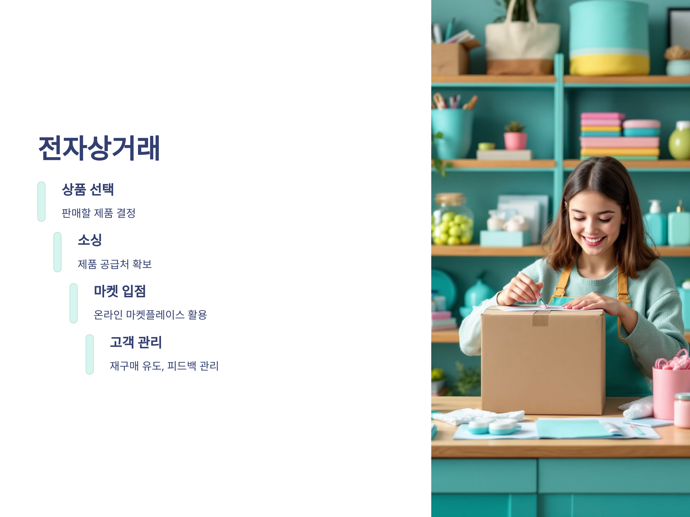 전자상거래의 장점은 무엇일까요? 첫째, 자본이 많지 않아도 소규모로 시작할 수 있다는 점입니다. 둘째, 온라인 마켓플레이스를 활용하면 홍보와 판매가 동시에 이루어져 마케팅 부담이 줄어듭니다. 셋째, 상품을 팔고 나서도 계속해서 고객과 소통하며 재구매를 유도할 수 있습니다.