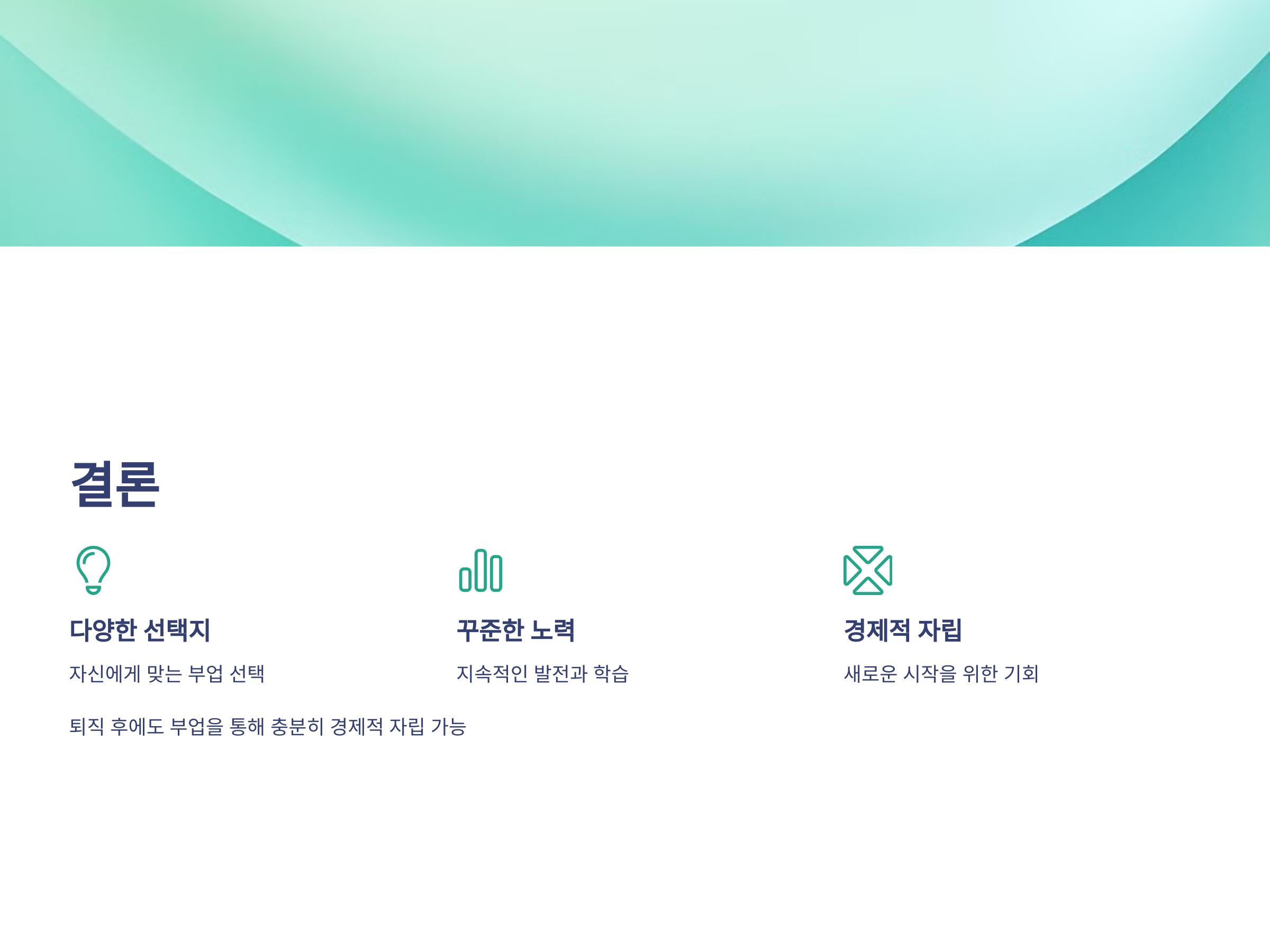퇴직 후에도 새로운 부업을 통해 충분히 경제적인 자립을 할 수 있으므로, 자신에게 맞는 부업을 선택하고 꾸준히 발전시켜 나가세요. 여러분의 새로운 시작을 응원합니다!