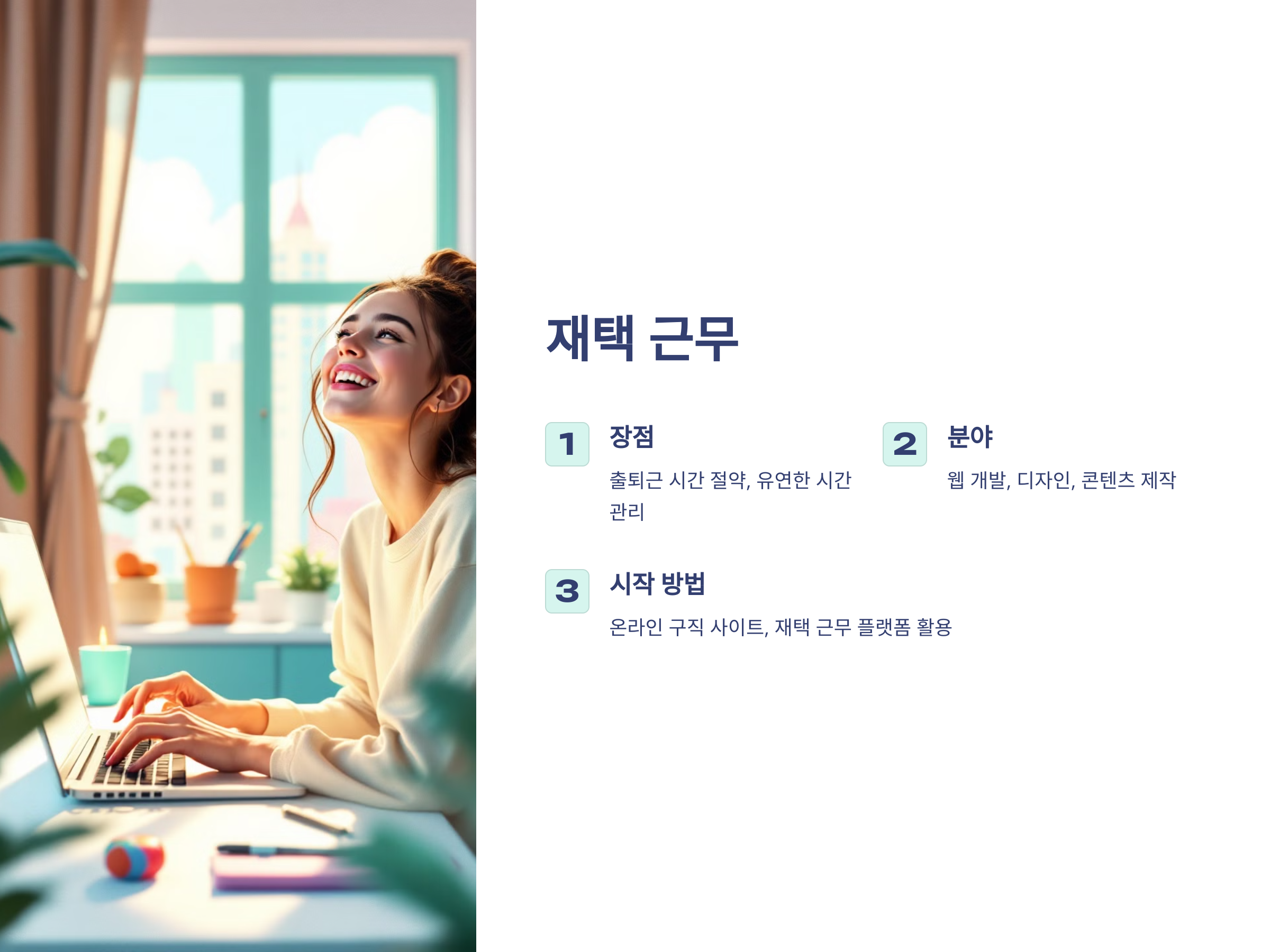재택 근무의 장점은 무엇일까요? 첫 번째로, 출퇴근 시간과 교통비를 절약할 수 있다는 점입니다. 두 번째로, 자신이 가장 효율적으로 일할 수 있는 시간대를 선택할 수 있습니다. 예를 들어, 아침에 더 집중력이 좋다면 아침에 업무를 끝내고 여유를 가질 수 있죠. 세 번째로, 회사의 규칙이나 분위기에 얽매이지 않고 독립적인 작업 환경에서 일할 수 있다는 점입니다.