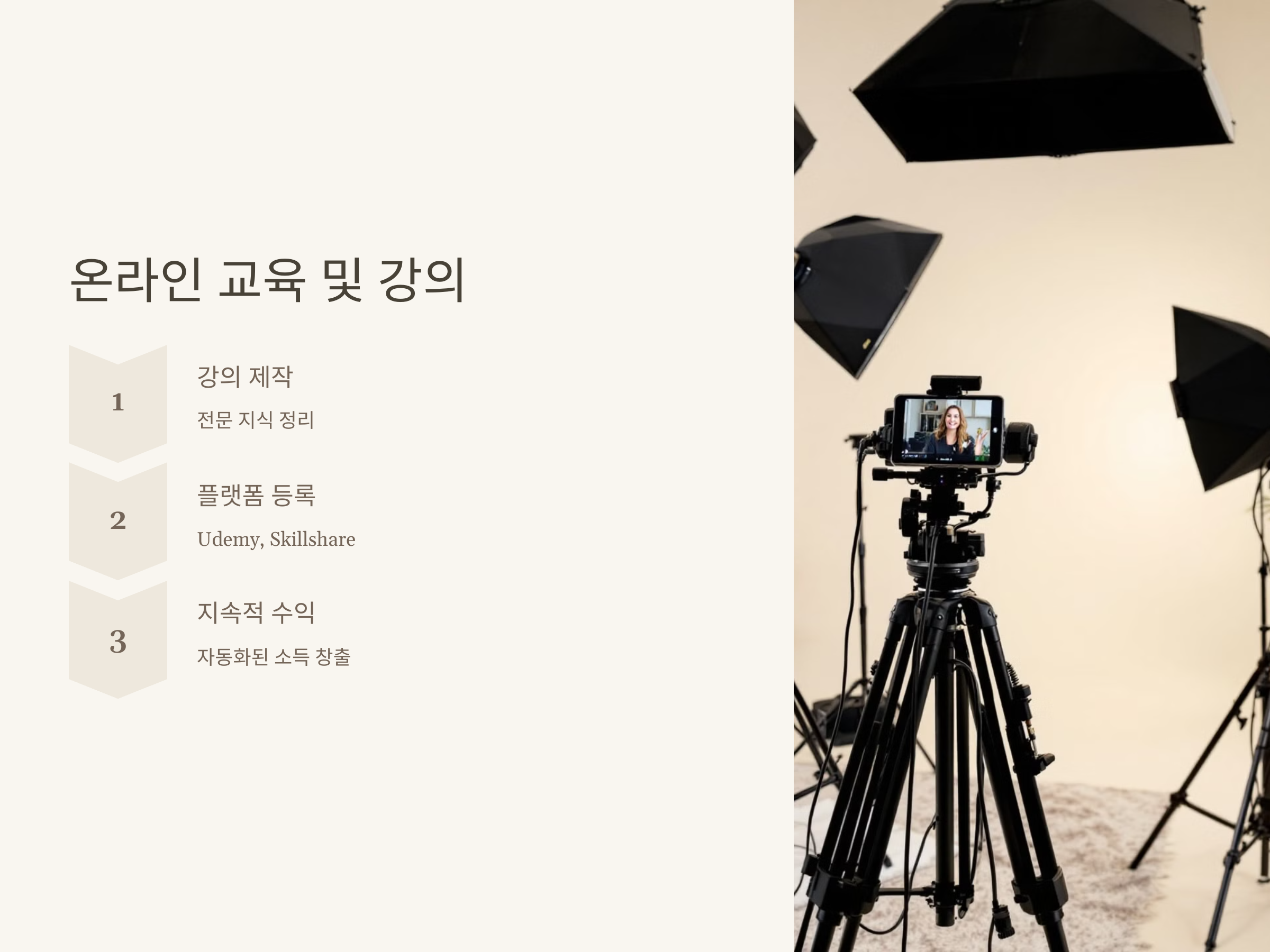 강의는 일회성으로 끝나는 것이 아니라 지속적으로 수익을 창출할 수 있는 매력적인 방법입니다. 강의를 통해 다른 사람들에게 유용한 정보를 제공하고, 그 대가로 소득을 얻을 수 있습니다.