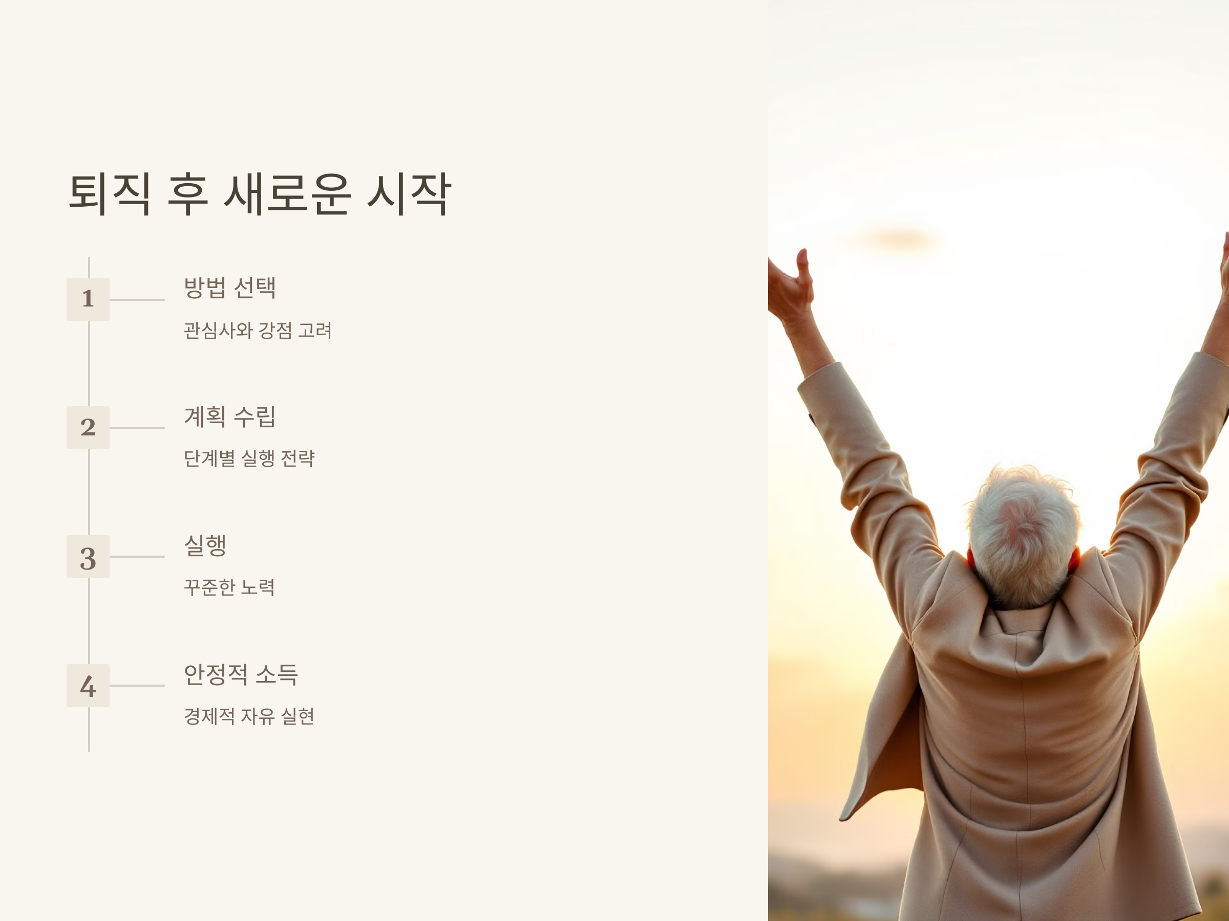 이제 퇴직 후 경제적 안정성을 유지하려면 이러한 방법들을 활용해 보세요. 퇴직은 끝이 아니라 새로운 시작입니다. 다양한 소득 창출 방법을 통해 더욱 풍요롭고 만족스러운 퇴직 생활을 즐기시길 바랍니다.