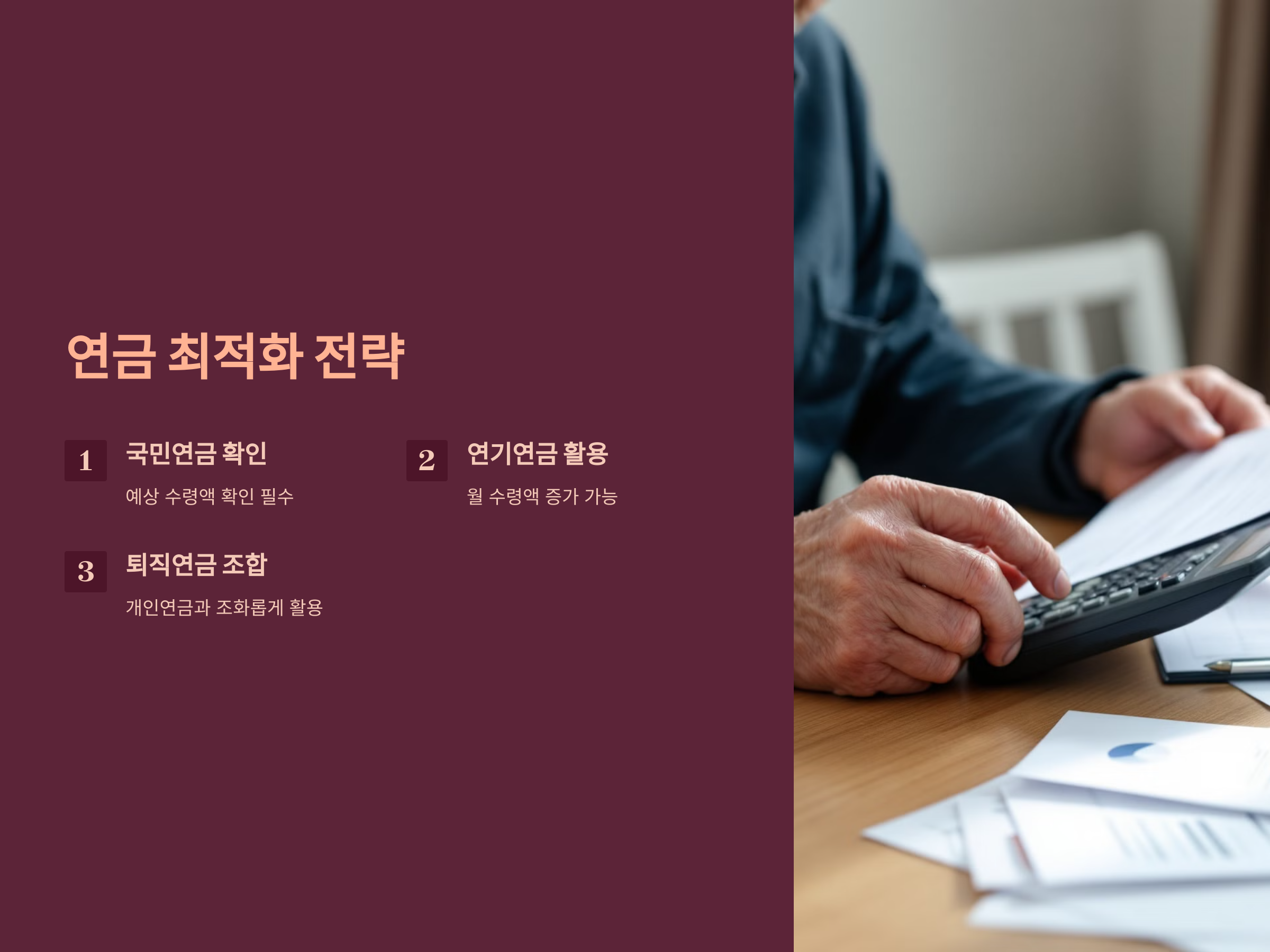 연금 수령을 최대화하려면 먼저 국민연금 예상 수령액을 확인하고, 연기연금을 활용하여 월 수령액을 증가시키는 방안을 고려해야 합니다. 퇴직연금과 개인연금도 조화롭게 활용하여 일정한 현금 흐름을 유지하는 것이 핵심입니다. 또한, 연금 외에도 배당주 투자나 부동산 임대소득과 같은 추가적인 소득원을 만들어 두면 더욱 안정적인 재정 운영이 가능합니다.