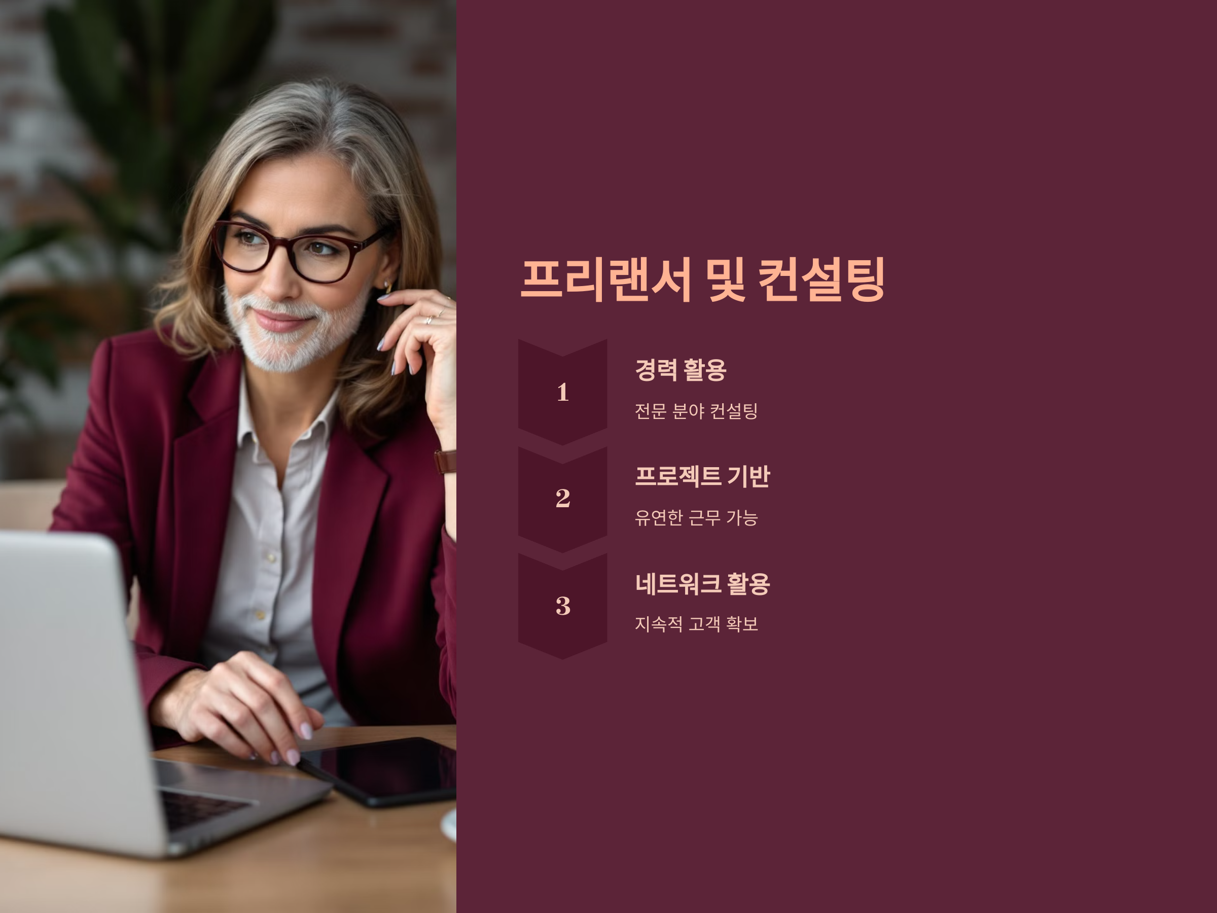 퇴직 후에도 자신의 경력을 살려 프리랜서로 활동하거나 컨설팅 업무를 수행하면 안정적인 추가 소득을 얻을 수 있습니다. 기업들은 경험이 풍부한 전문가를 선호하며, 프로젝트 기반으로 일할 경우 시간과 장소에 구애받지 않고 유연하게 일할 수 있습니다.