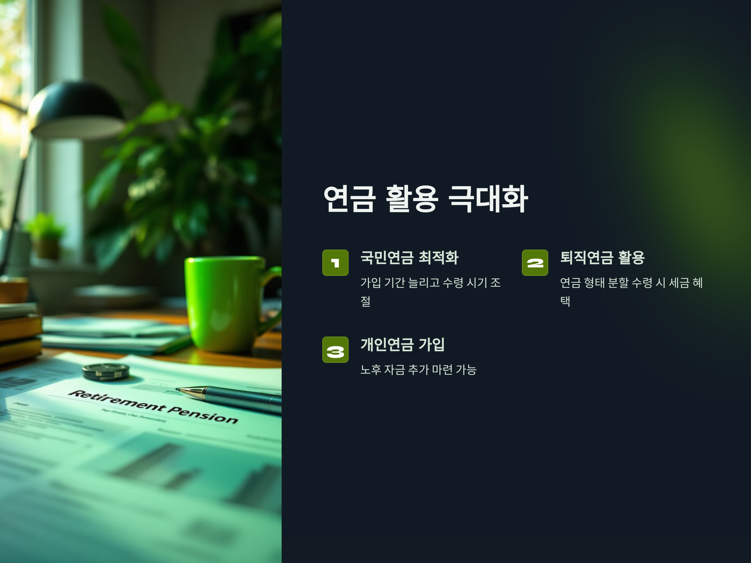 국민연금은 기본적인 노후 소득원이므로, 가입 기간을 최대한 늘리고 수령 시기를 조절하여 연금액을 극대화하는 전략이 필요합니다. 예를 들어, 연금 수령 시기를 늦추면 월 지급액이 증가합니다.