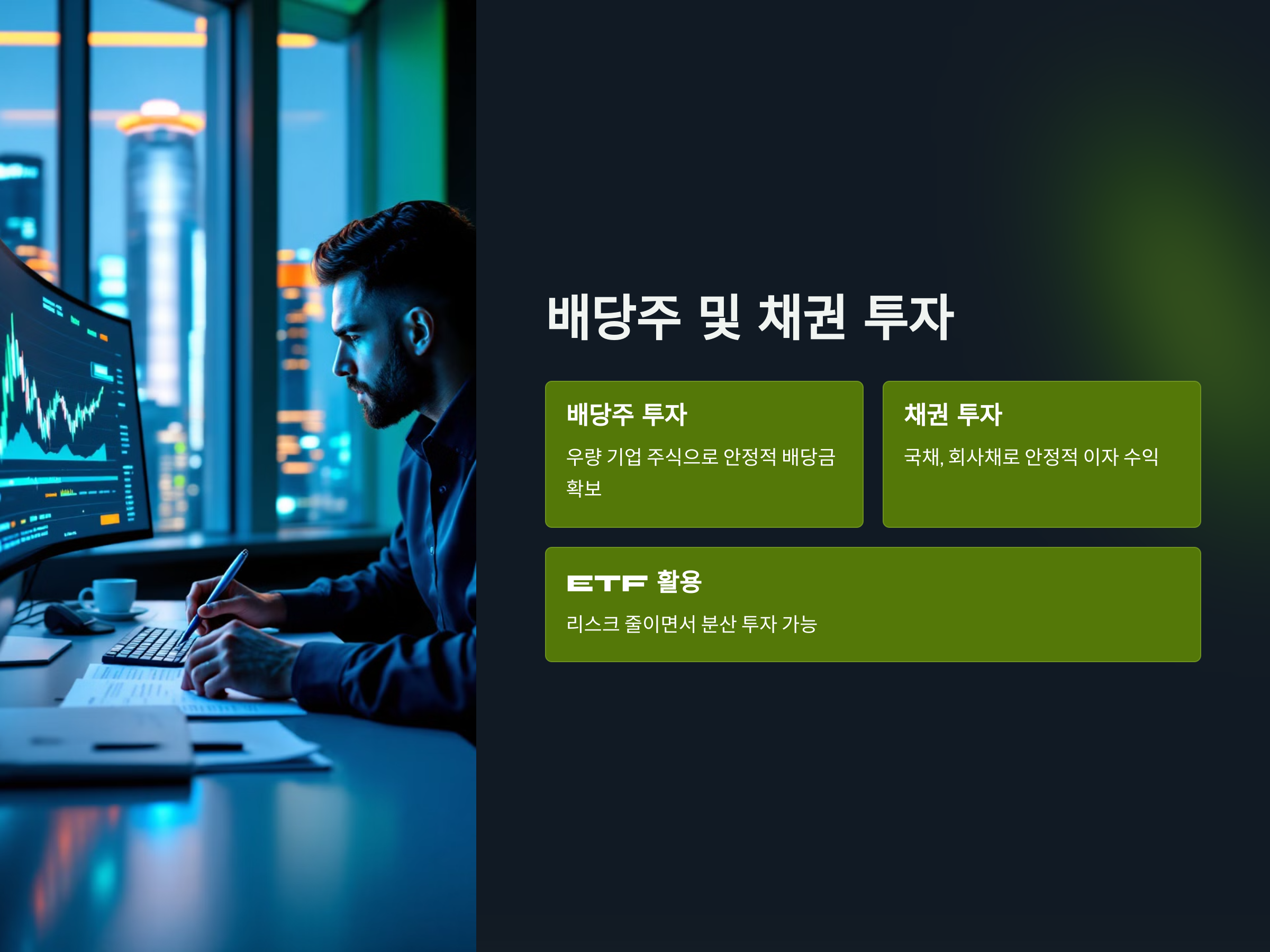 배당주 ETF나 채권 ETF를 활용하면 개별 종목 투자보다 리스크를 줄이면서도 수익을 기대할 수 있습니다.