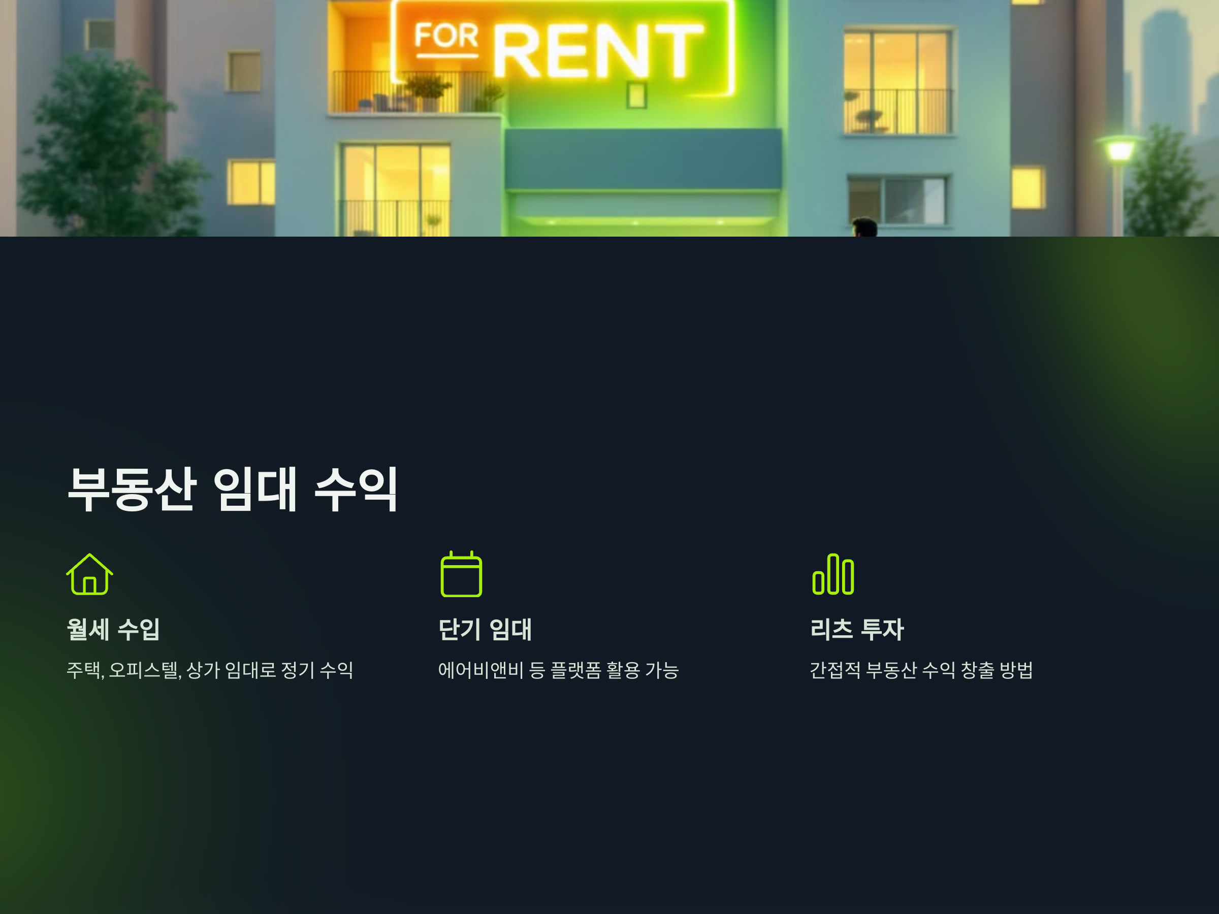 주택, 오피스텔, 상가 등을 임대하여 정기적인 월세 수익을 창출할 수 있습니다.