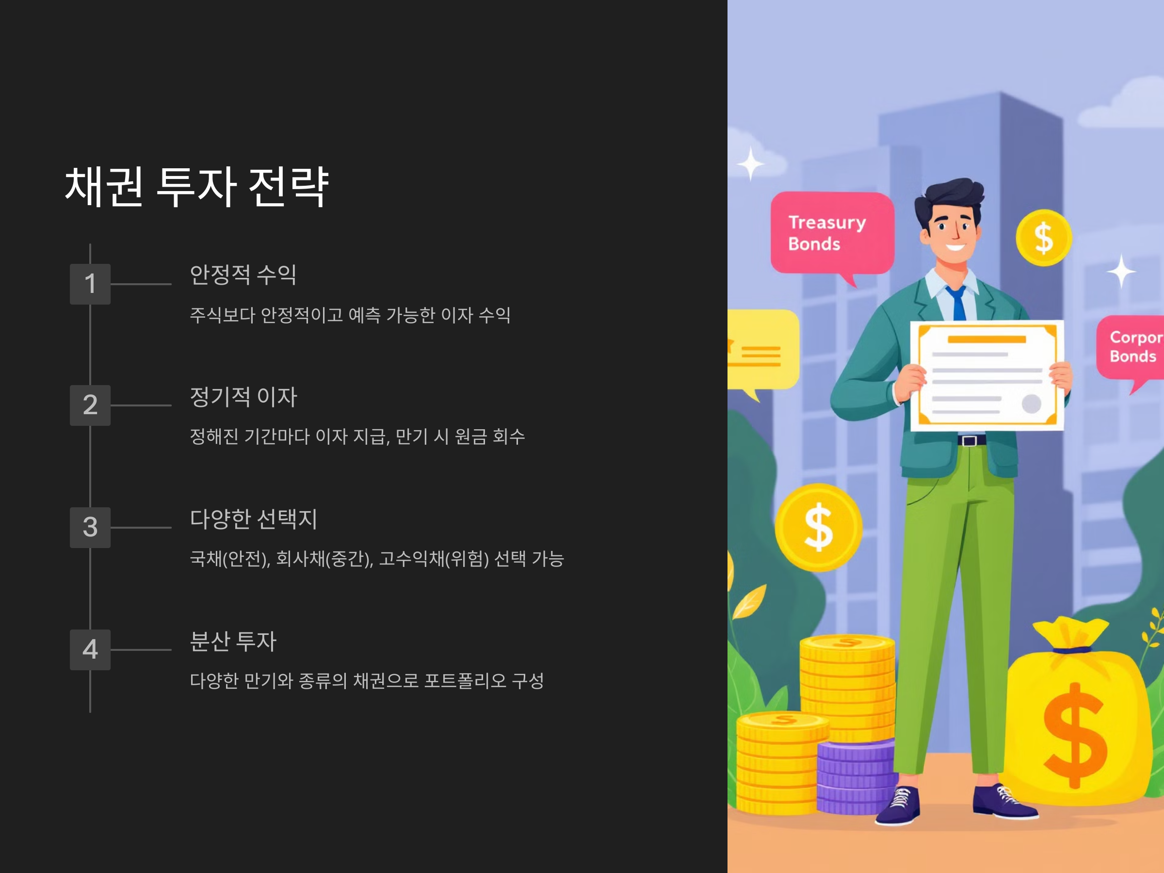 채권 투자에는 다양한 종류가 있으며, 각기 다른 리스크가 존재합니다. 국채나 우량 기업채는 안정적이지만, 상대적으로 수익률이 낮을 수 있습니다. 반면, 고위험 고수익 채권을 선택하면 더 높은 수익을 기대할 수 있지만 리스크가 커지기 때문에 분산 투자를 고려해야 합니다.
