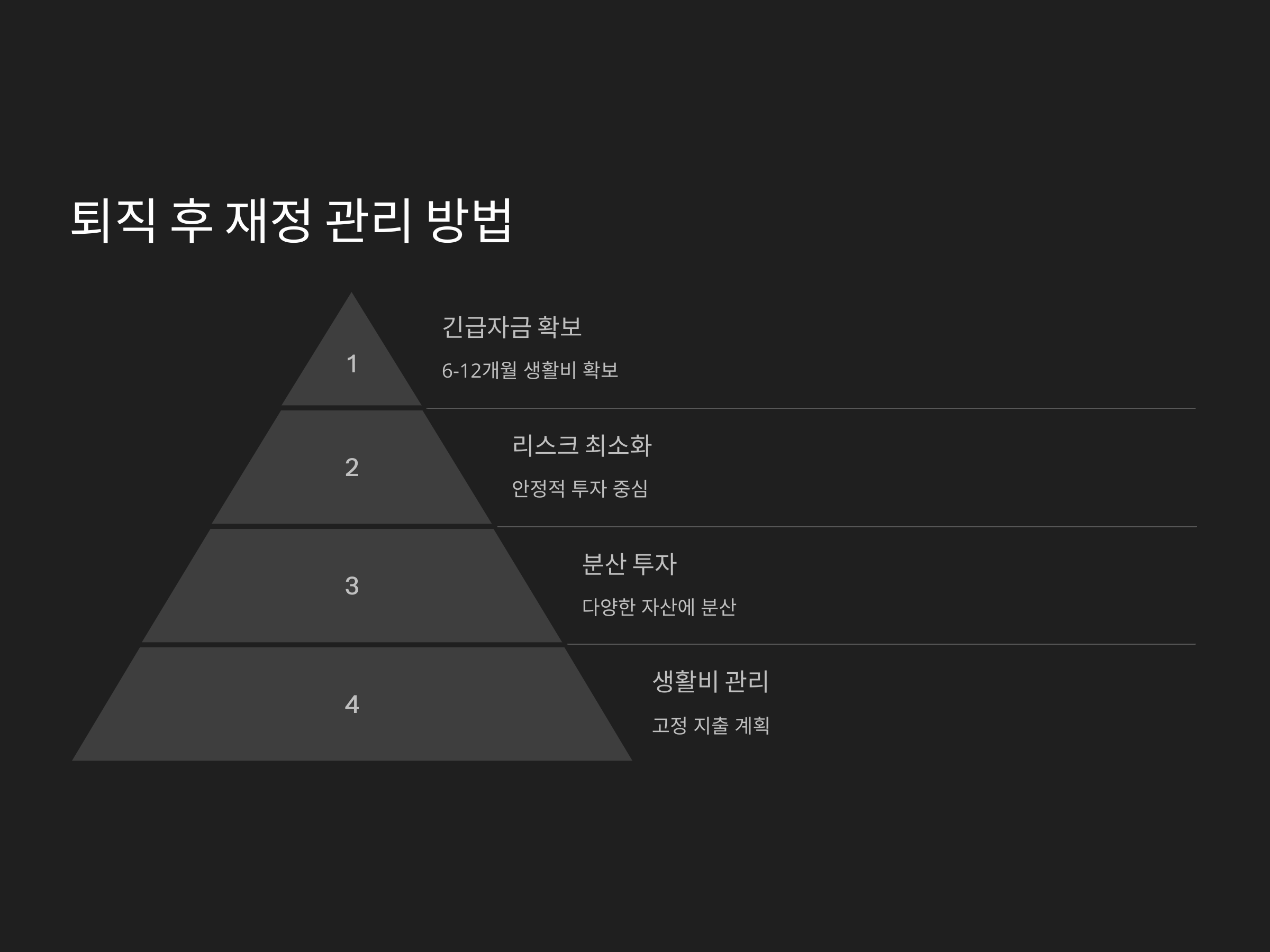 퇴직 후 재정 관리는 하나의 큰 프로젝트입니다. 철저한 계획을 세워, 미래의 경제적 불안을 줄여나가세요.