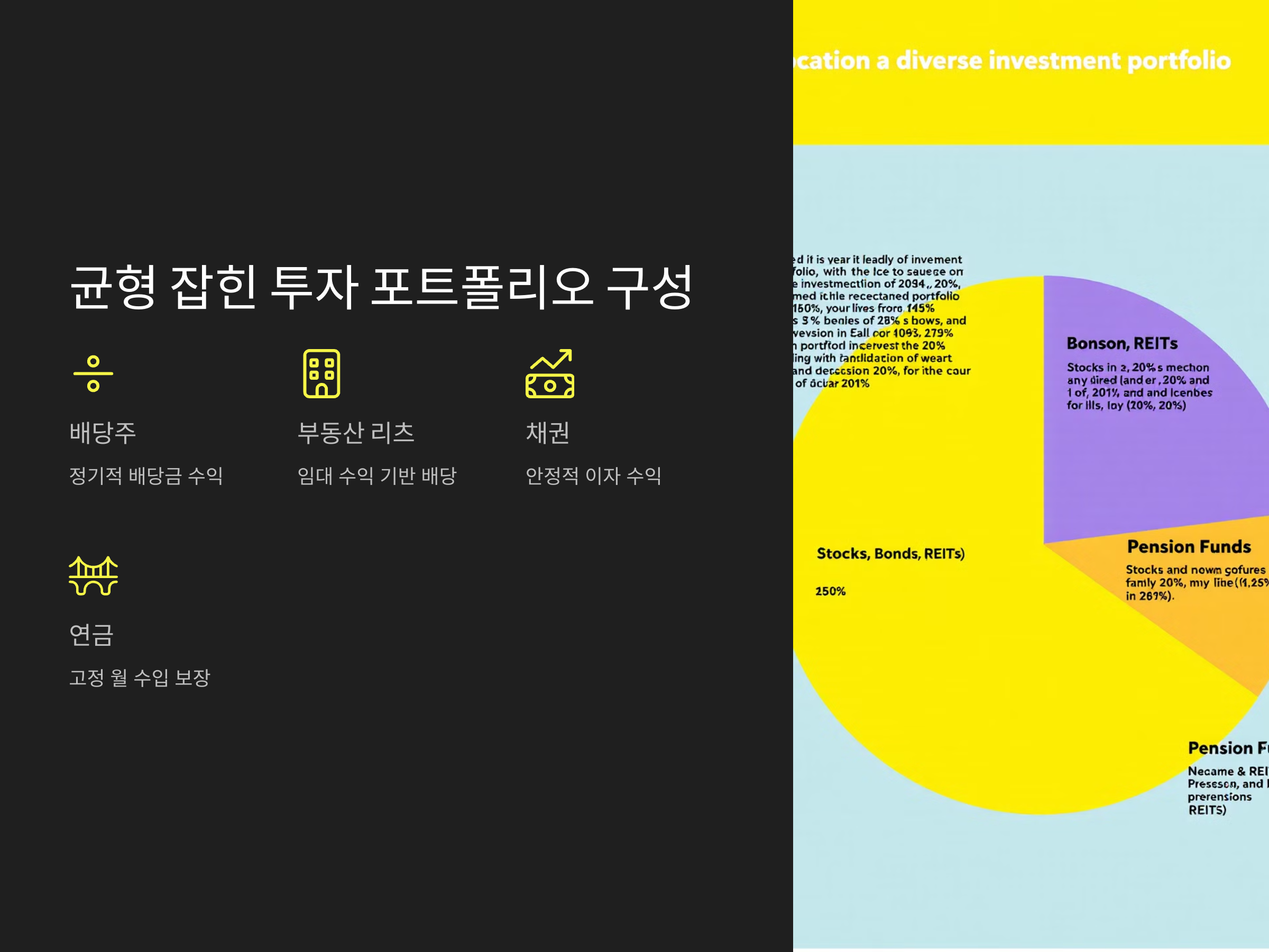 그 중에서도 배당주 투자, 부동산 리츠(REITs), 채권 투자, 그리고 연금형 상품 등은 퇴직 후에도 비교적 안정적인 현금 흐름을 제공할 수 있는 투자 방법입니다. 각 방법에 대해 자세히 살펴보면서 어떤 방법이 나에게 적합한지 찾아보세요.