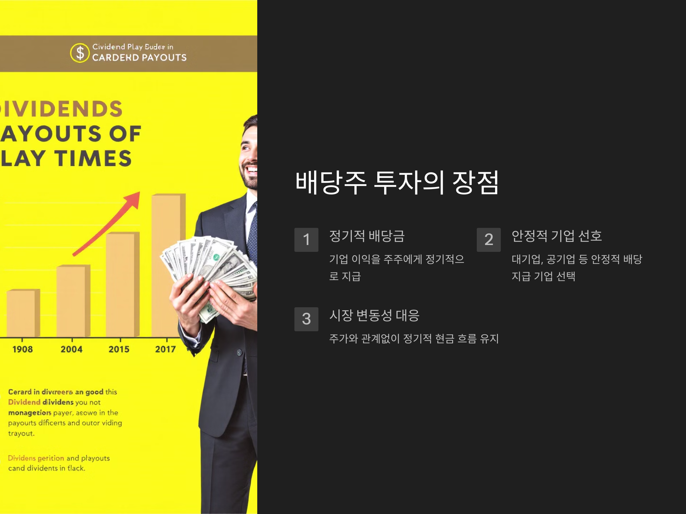 배당주 투자는 초보자도 시작하기 좋은 방법입니다. 장기적으로 배당금을 재투자하거나 현금을 받아 생활비로 사용할 수 있기 때문에, 퇴직 후에도 월급처럼 지속적인 수입을 기대할 수 있습니다. 다만, 주식 시장의 리스크가 존재하므로 분산 투자와 함께 신중한 선택이 필요합니다.