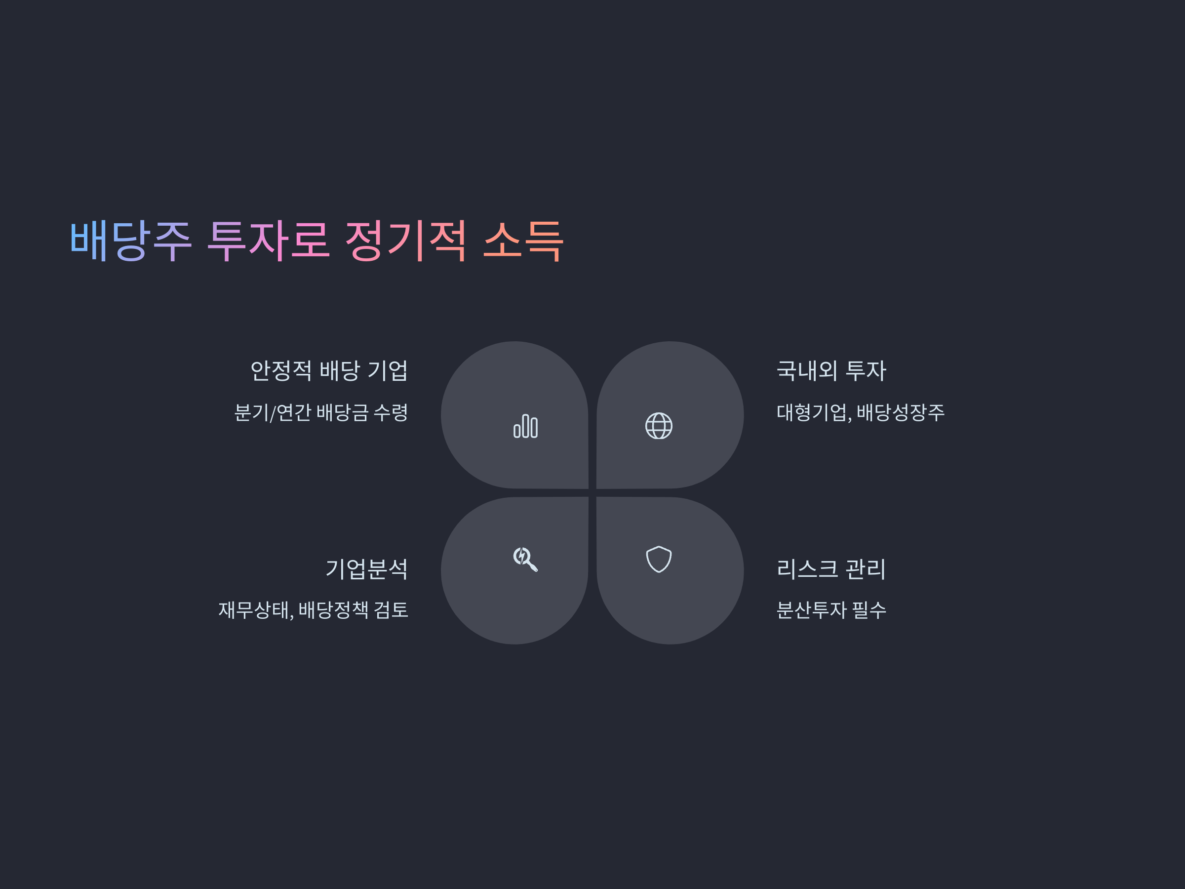 배당주는 기업이 이익의 일부를 주주들에게 배당금으로 지급하는 주식입니다. 안정적인 배당을 제공하는 기업의 주식을 보유하면 분기별 또는 연간으로 배당금을 받을 수 있어 꾸준한 소득원을 확보할 수 있습니다. 예를 들어, 국내 대형 기업이나 해외의 배당 성장주에 투자하는 것이 한 방법입니다. 다만, 주식 시장의 변동성에 따른 리스크를 관리하기 위해 분산 투자를 고려하고, 기업의 재무 상태와 배당 정책을 면밀히 분석하는 것이 중요합니다.
