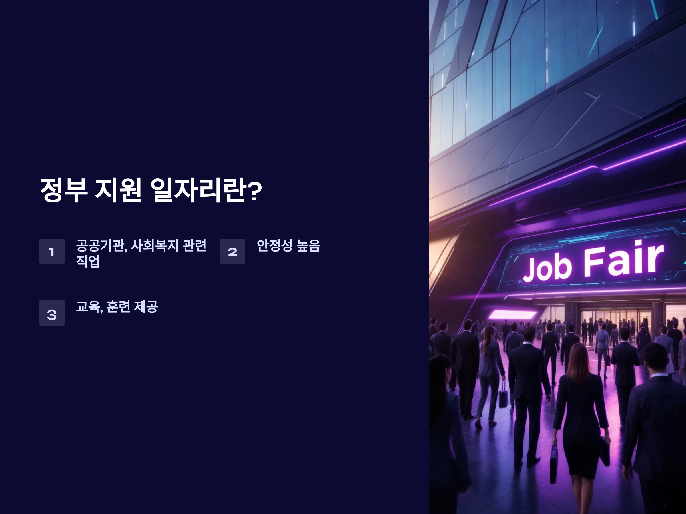 퇴직 후 정부 지원 일자리는 보통 정부에서 제공하는 공공기관이나 사회복지 관련 직업을 말합니다. 정부가 직접 일자리를 제공하는 것 외에도, 다양한 훈련 프로그램과 취업 알선 서비스도 제공되며, 이는 주로 공공기관, 지자체, 그리고 고용노동부 산하 기관을 통해 이루어집니다.
