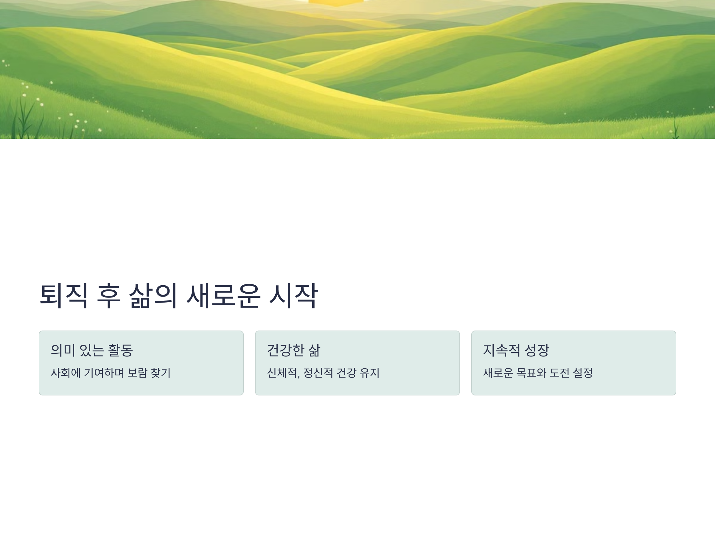 퇴직은 끝이 아니라 새로운 시작입니다. 이제는 더 이상 출퇴근에 구애받지 않지만, 대신 자유로운 시간을 어떻게 잘 활용할지가 중요합니다. 이 시기를 잘 보내면, 더 풍성하고 의미 있는 삶을 살 수 있습니다.