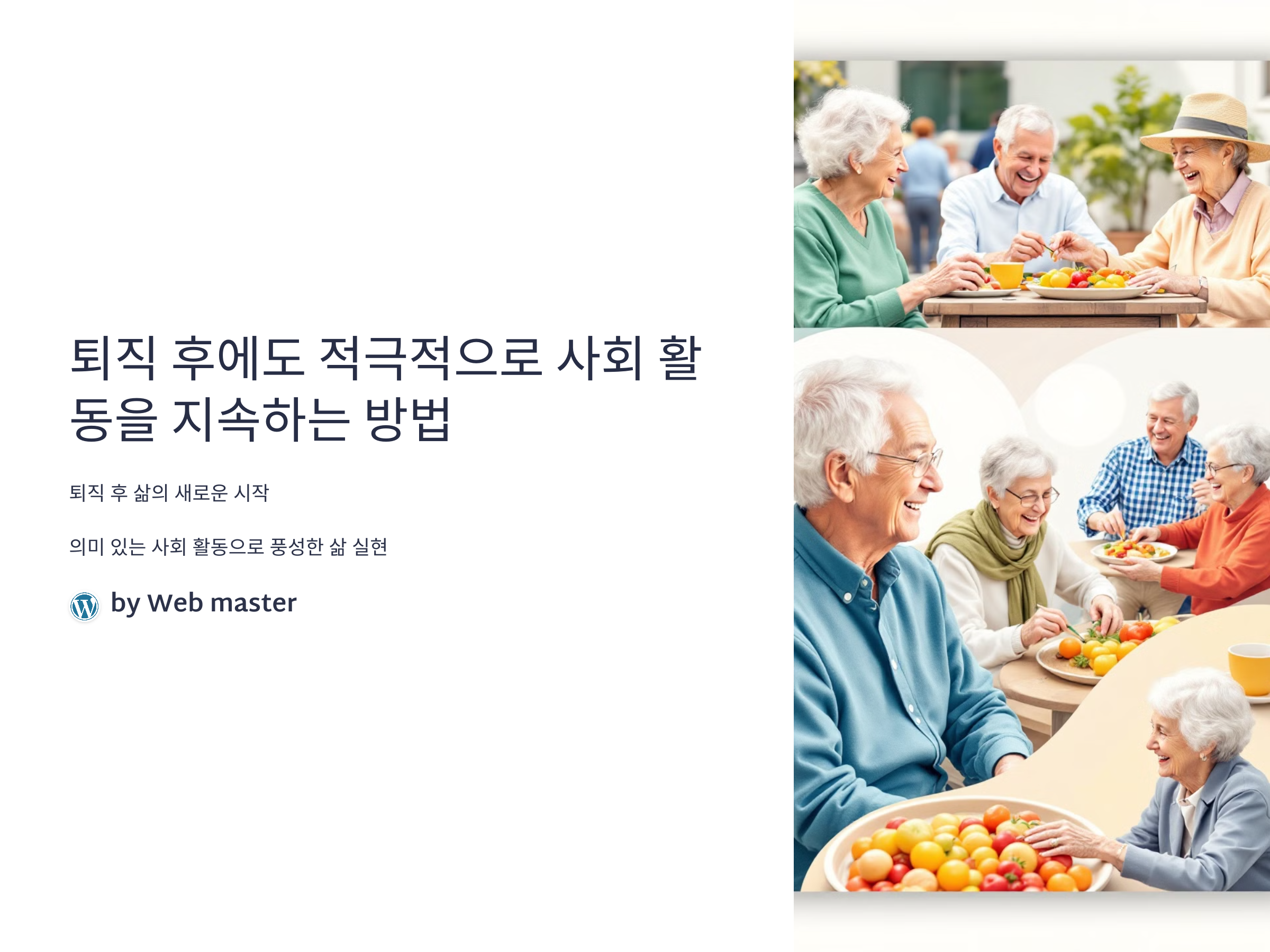 퇴직 후에도 사회 활동을 지속하는 것은 매우 중요한 일입니다. 퇴직 후에도 사회에 기여하고, 개인적인 성장과 만족을 얻을 수 있는 기회입니다. 다양한 방법으로 사회 활동을 이어가며, 자신의 경험과 지식을 나누는 것이 퇴직 후에도 활기차고 의미 있는 삶을 살 수 있게 도와줍니다. 자원봉사, 멘토링, 네트워킹, 재능 기부 등 다양한 방법을 통해 자신만의 활동을 만들어보세요.