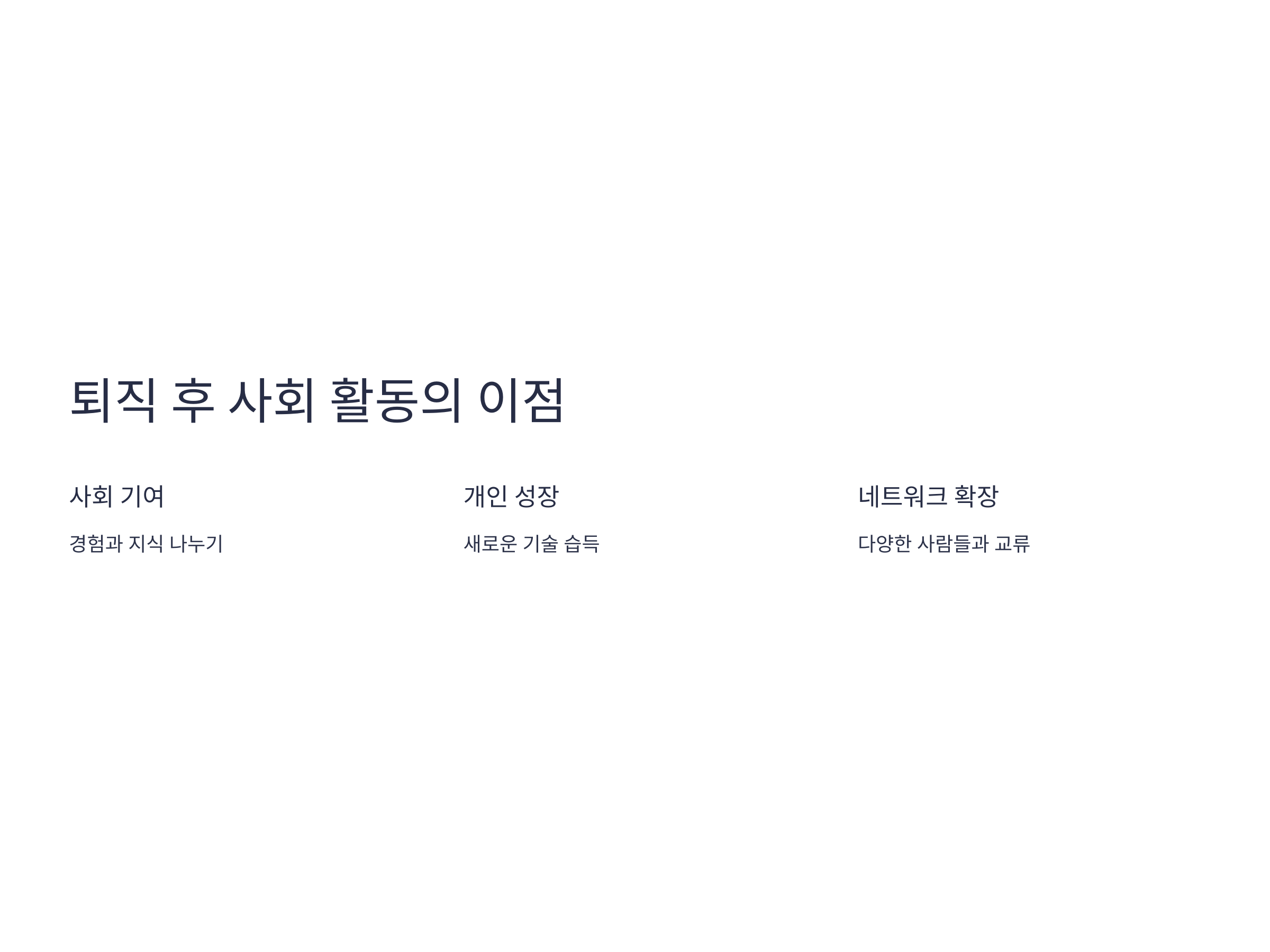 퇴직 후에는 많은 시간이 있지만, 이를 어떻게 활용하느냐가 중요합니다. 사회적 활동을 통해 다른 사람들과 교류하고, 자신에게 의미 있는 일을 찾는다면 퇴직 후 삶은 더욱 충실해질 것입니다.