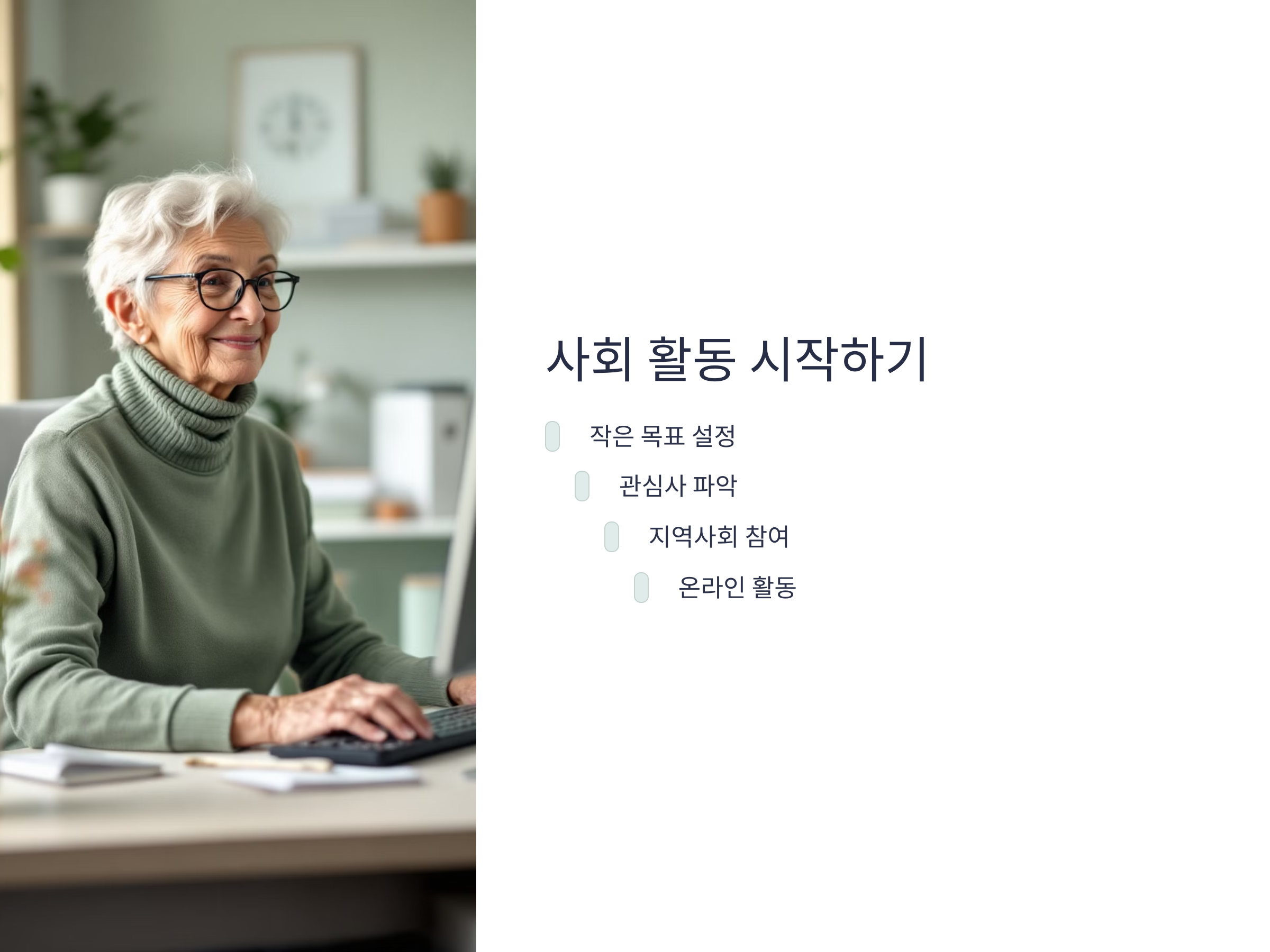 퇴직 후에도 사회 활동을 계속하는 것은 당신의 삶을 더욱 의미 있게 만들어 줄 수 있는 방법입니다. 자원봉사, 멘토링, 취미 활동, 재능 기부 등 다양한 방법을 통해 새로운 목표를 세우고, 활기차고 의미 있는 시간을 보내세요. 퇴직은 끝이 아니라 새로운 시작임을 기억하고, 더욱 풍요롭고 보람찬 삶을 위해 활동을 시작해 보세요.