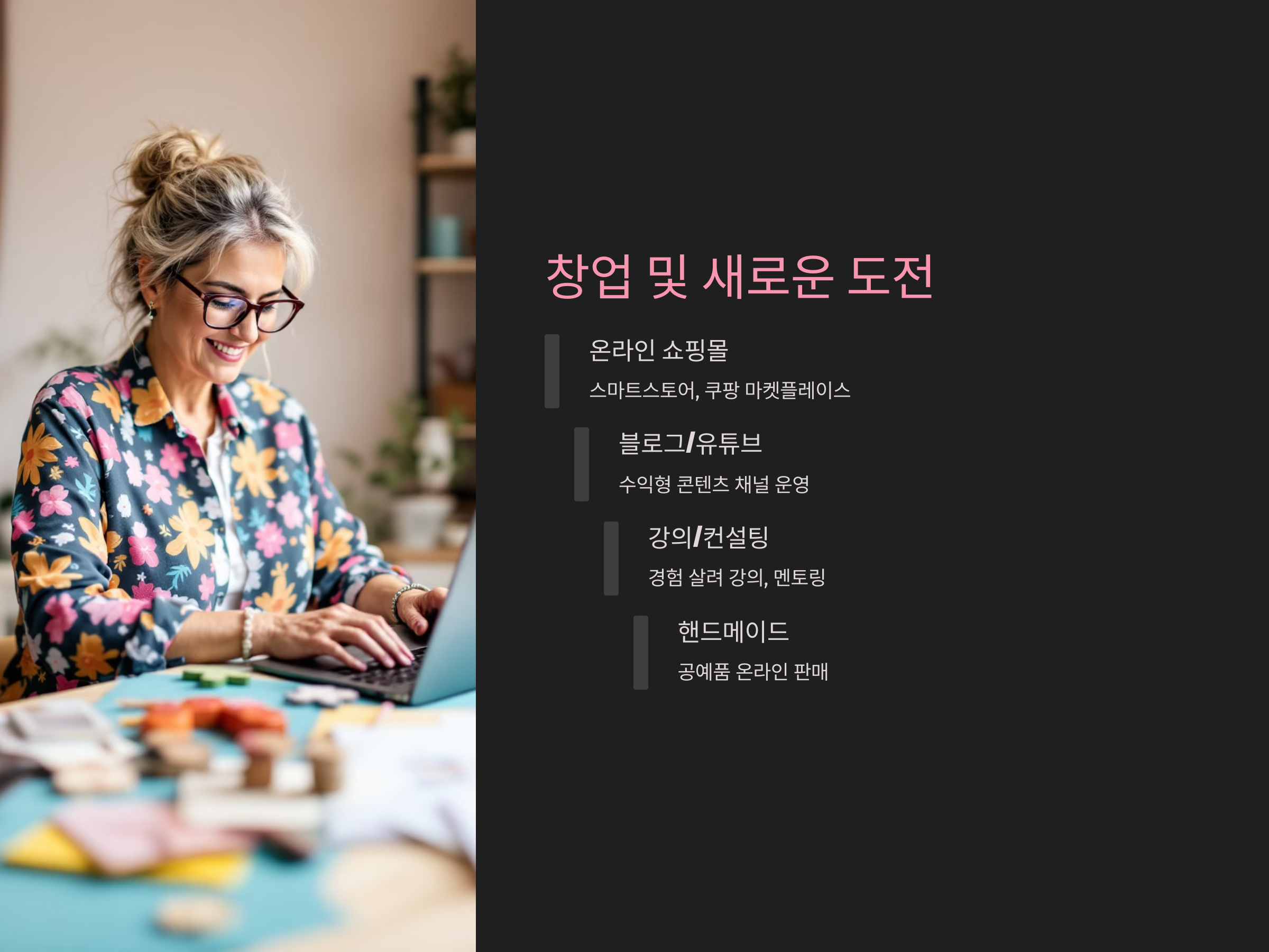 - 공예 및 핸드메이드 사업: 직접 만든 제품을 온라인에서 판매