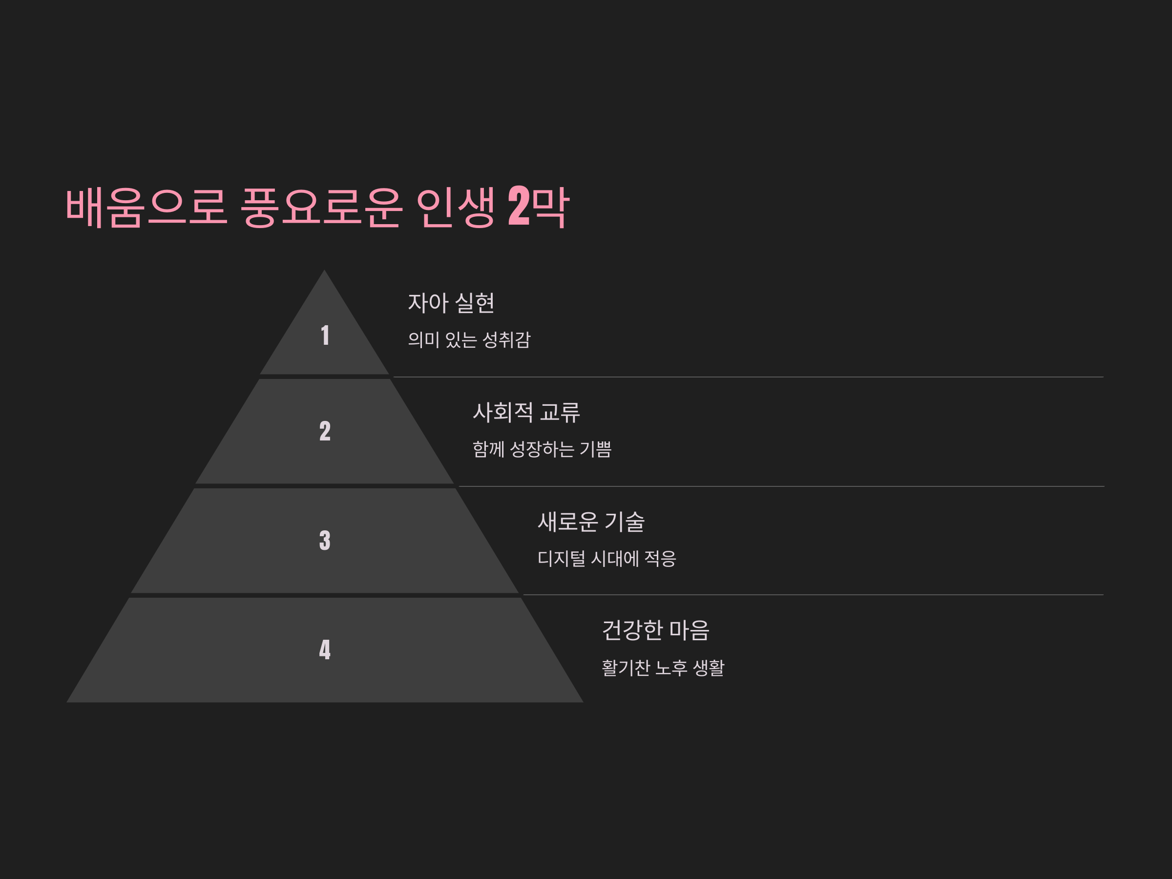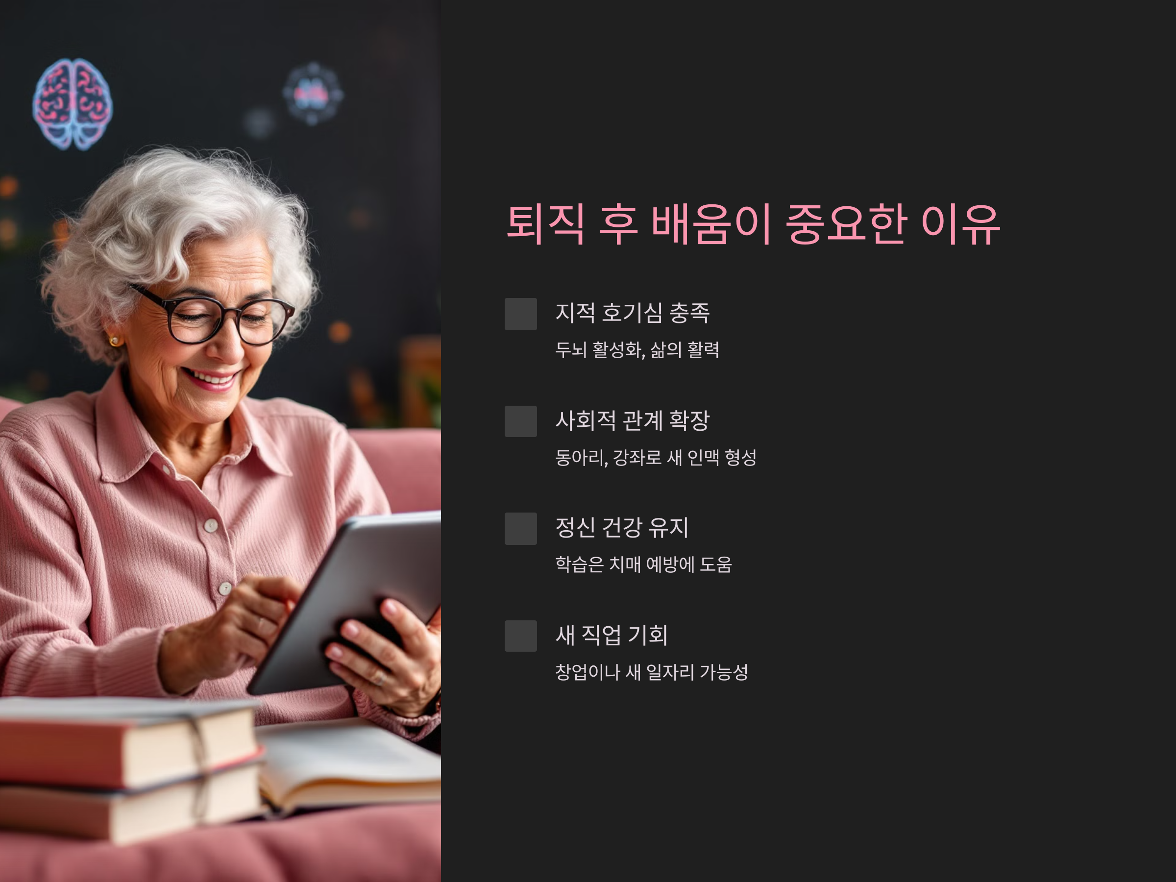 - 자아 실현: 배우면서 성취감을 느끼고, 퇴직 후에도 목표를 설정할 수 있습니다.