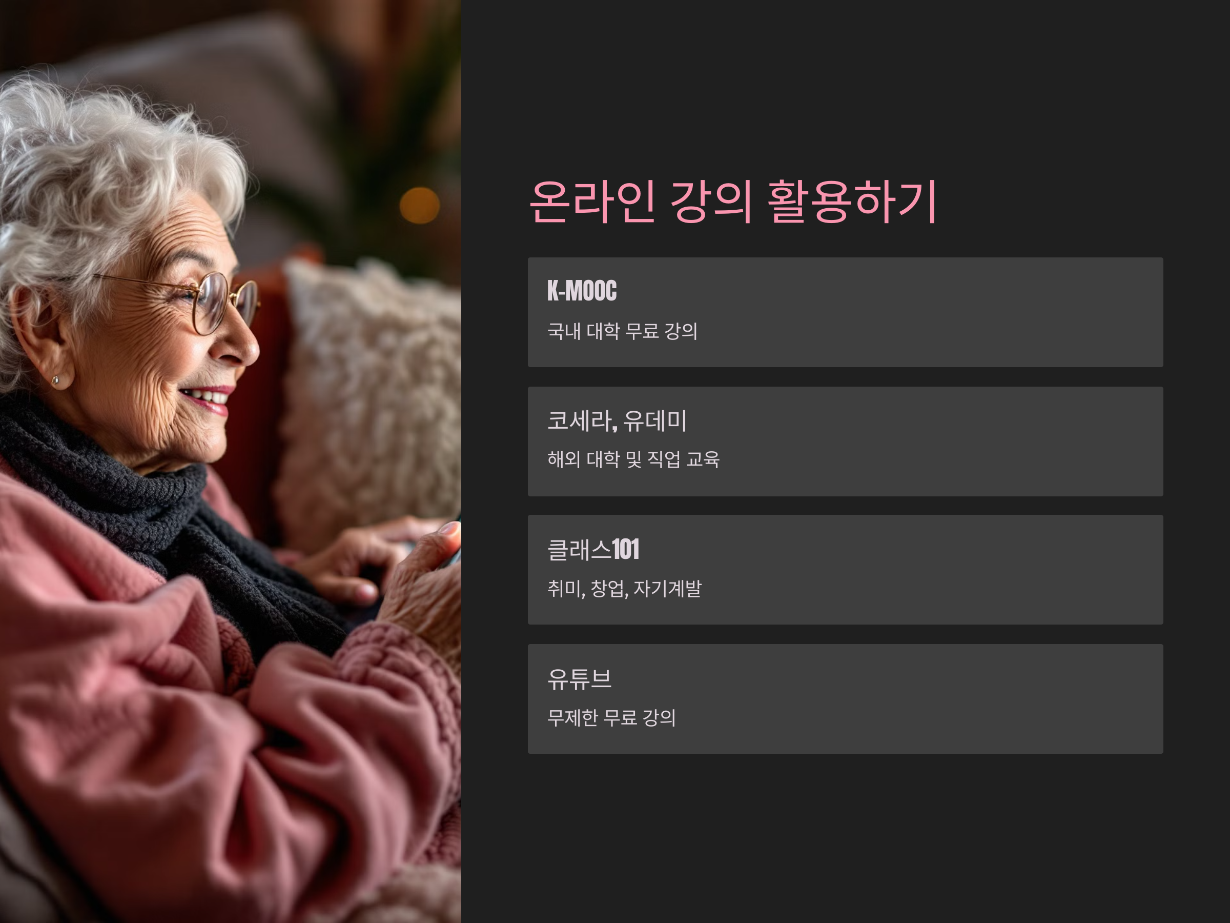 - K-MOOC (한국형 무크): 국내 대학의 수준 높은 강의를 무료로 제공