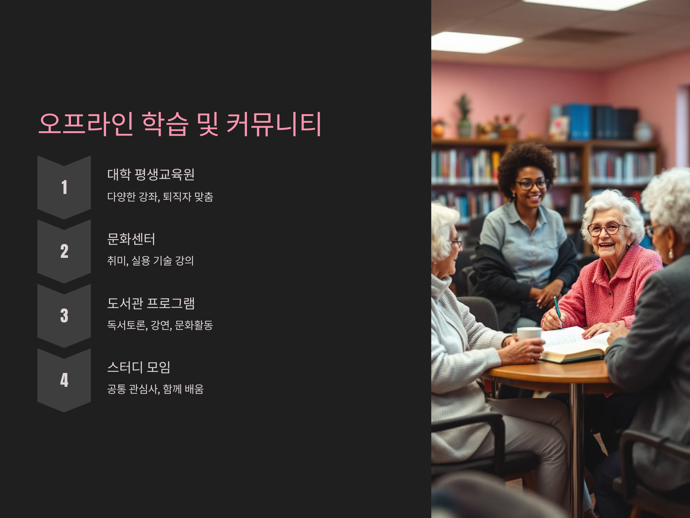 - 도서관 프로그램: 독서 토론, 강연, 문화 활동을 통해 배움의 기회 제공