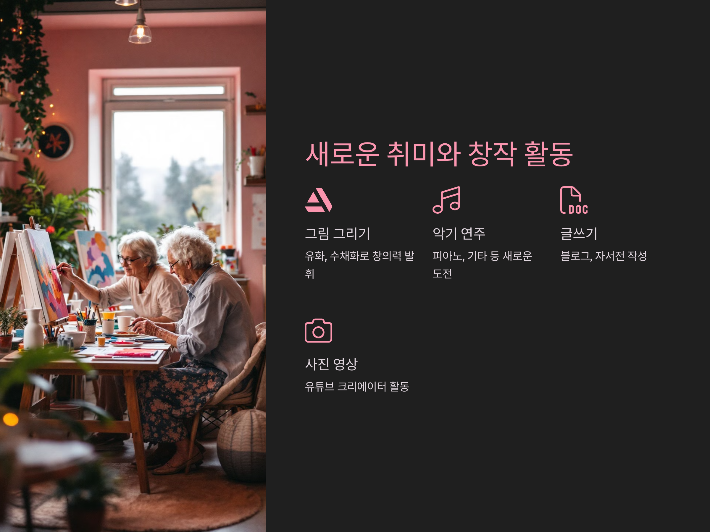 - 글쓰기: 블로그 운영, 자서전 쓰기 등 문학적 취미