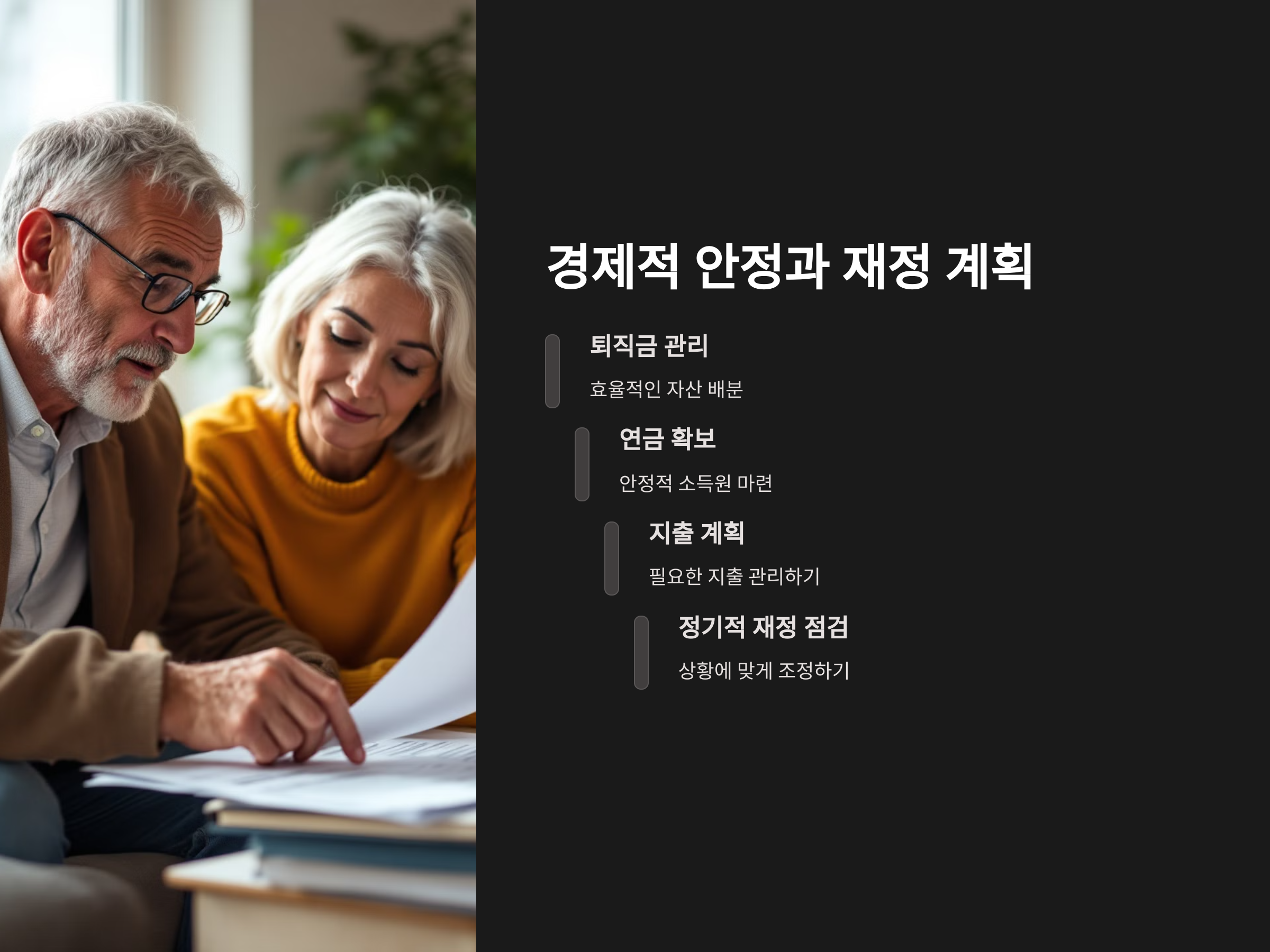 퇴직금을 효율적으로 관리하거나, 연금 등을 통해 안정적인 소득을 확보하는 방법을 고려해야 합니다. 재정적으로 안정되면 마음의 여유도 생기고, 노후에 대한 걱정 없이 즐겁게 생활할 수 있습니다.