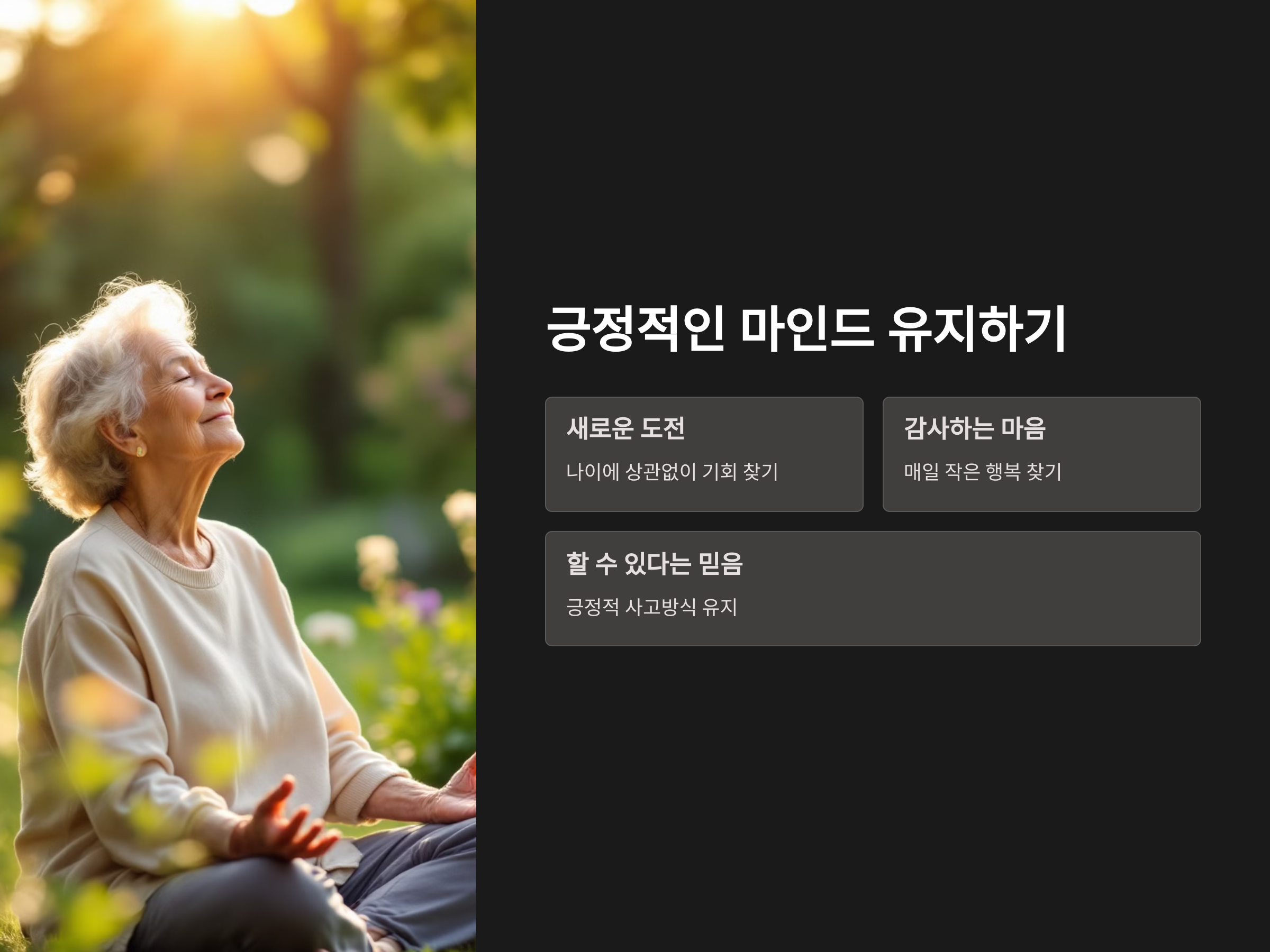 마지막으로, 퇴직 후 삶의 질을 높이기 위한 가장 중요한 비결은 긍정적인 마음가짐을 유지하는 것입니다. 나이가 들어도 새로운 도전과 기회는 항상 존재하며, 긍정적인 사고방식을 통해 이를 잘 활용할 수 있습니다. 노년기를 즐겁게 보내기 위해서는 '할 수 있다'는 믿음을 가지는 것이 중요합니다.