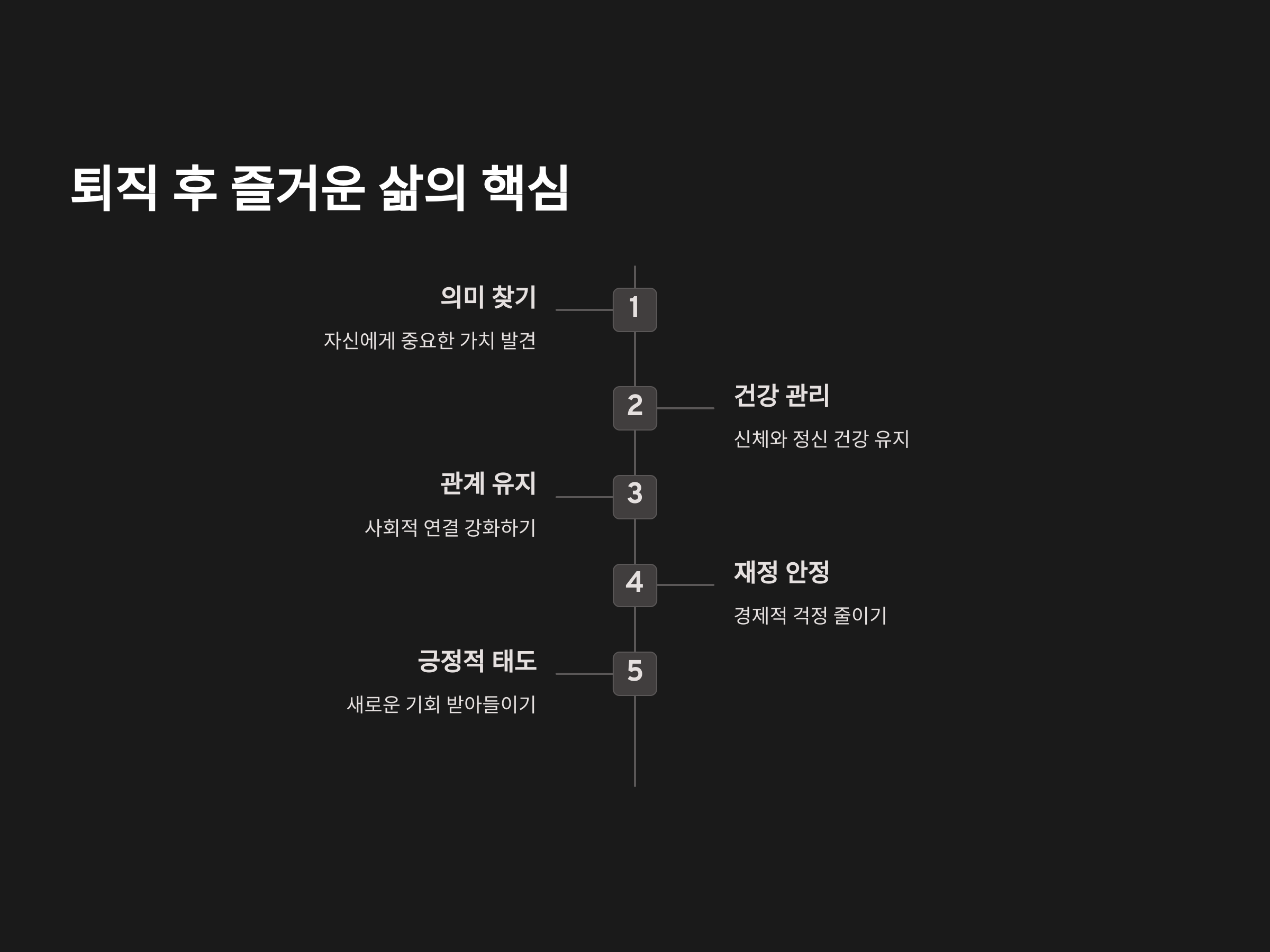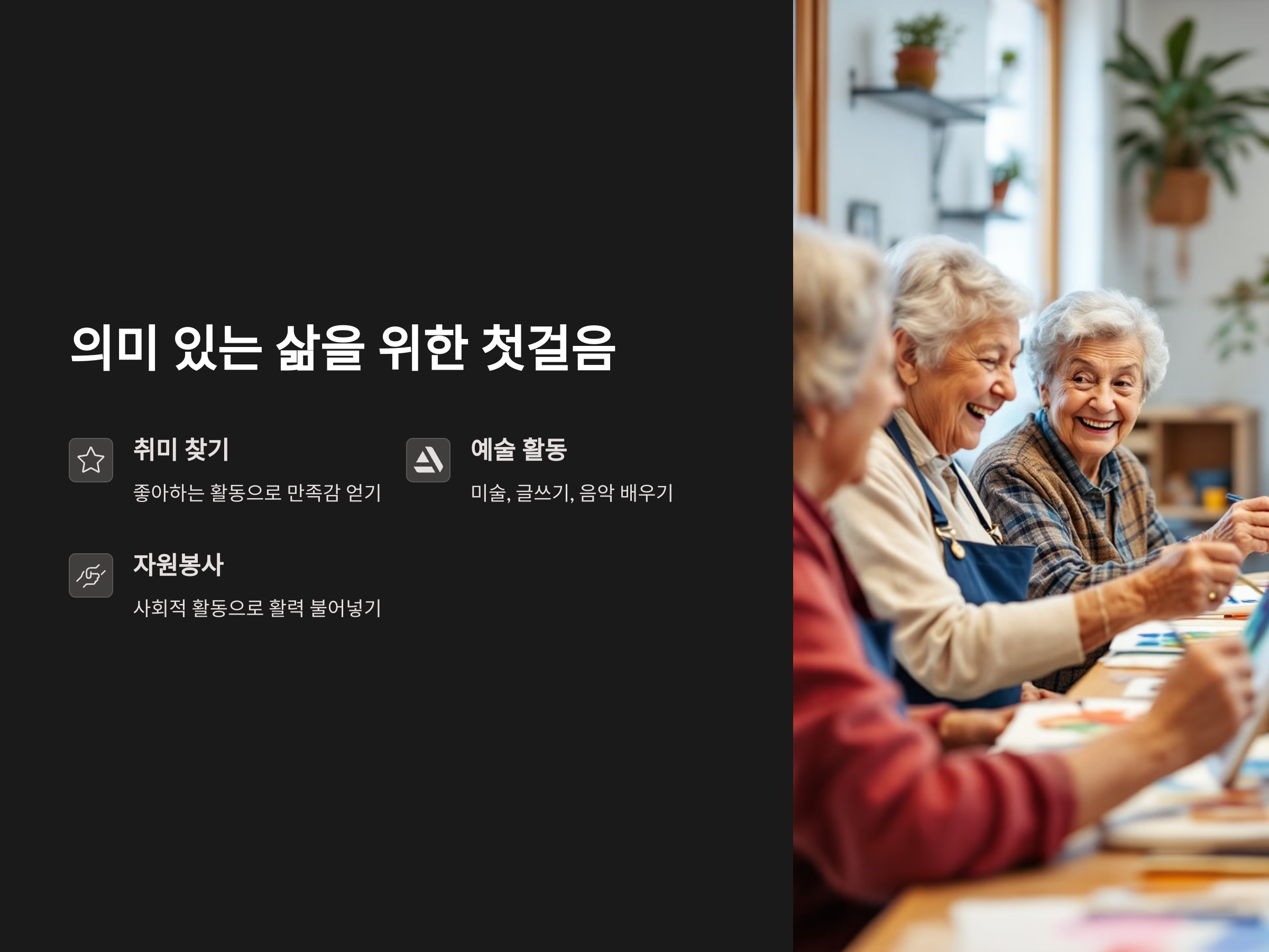 퇴직 후 삶에서 가장 중요한 것은 '의미 있는 삶'을 찾는 것입니다. 일터에서의 역할이 사라진 후에는 자신이 무엇을 하고 싶은지, 무엇이 나에게 의미가 있는지에 대해 고민해야 합니다. 좋아하는 취미를 즐기거나, 새로운 도전을 시작하는 것도 좋습니다. 중요한 건 자신에게 의미 있는 일을 찾고, 그것을 통해 만족감을 얻는 것입니다.