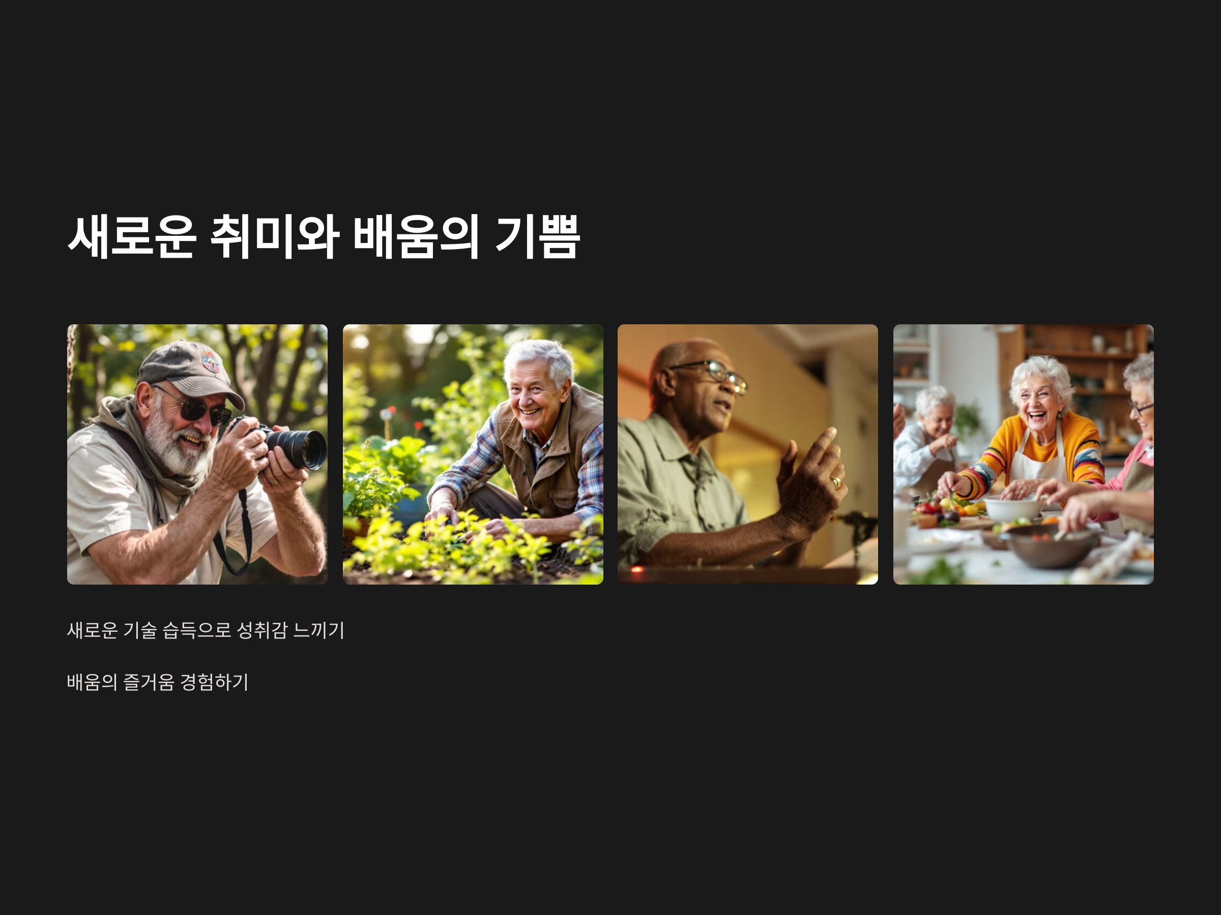 그 외에도, 온라인 커뮤니티에 참여하거나, 다양한 모임에 나가 사회적 활동을 지속하는 것도 좋은 방법입니다. 사회적 관계를 유지하고 확장하는 것은 정신적으로 건강한 노년기를 보낼 수 있는 중요한 요소입니다.