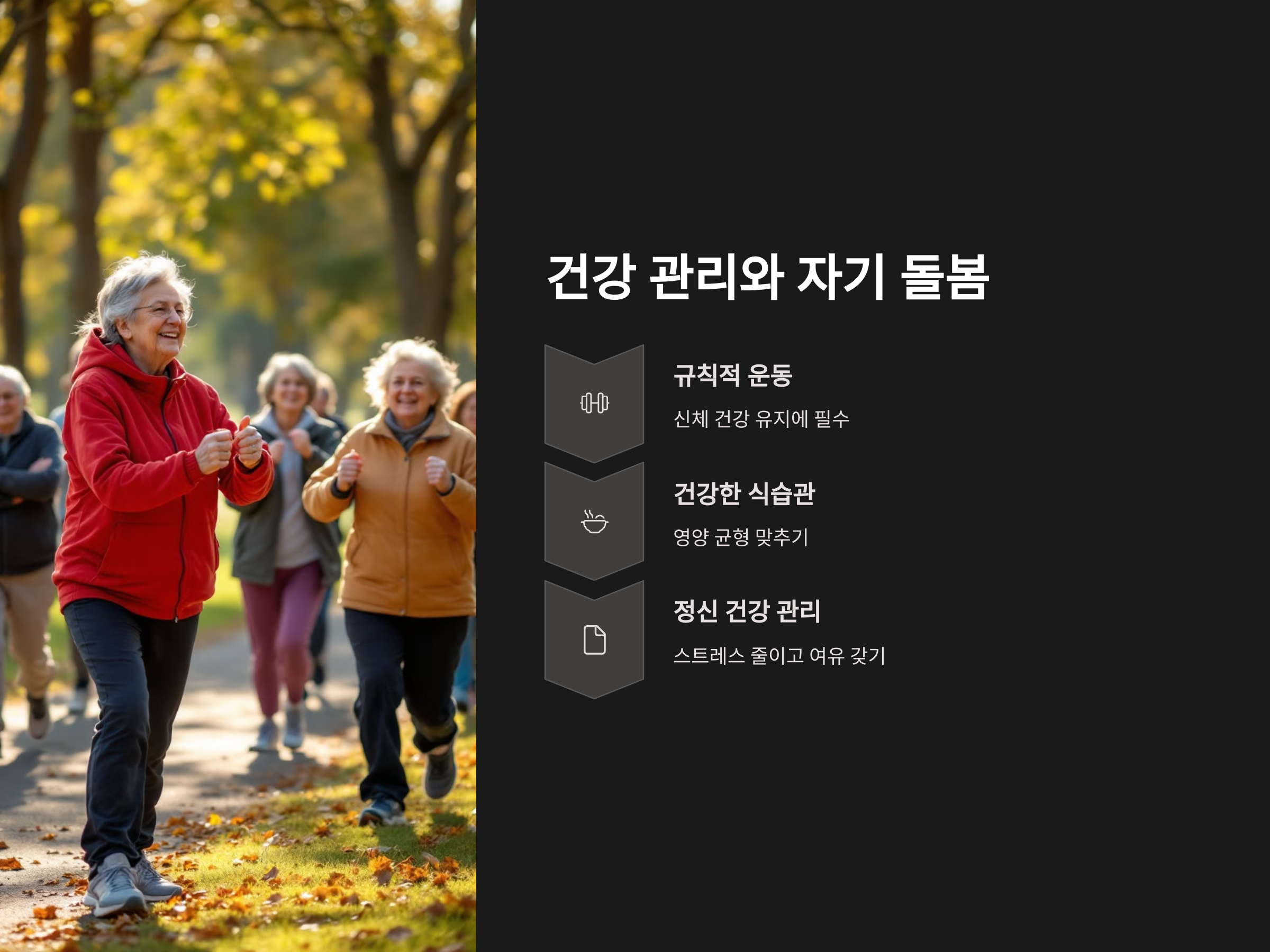 건강한 식습관과 규칙적인 운동을 통해 몸을 건강하게 유지하는 것은 노년기를 즐겁고 활기차게 보내는 데 필수적인 요소입니다. 적당한 운동은 신체 건강을 유지할 뿐만 아니라, 정신적으로도 활력을 줍니다. 더불어, 퇴직 후에는 더 여유 있는 시간을 가지게 되므로, 이 시간을 활용하여 건강한 생활습관을 만드는 것이 중요합니다.