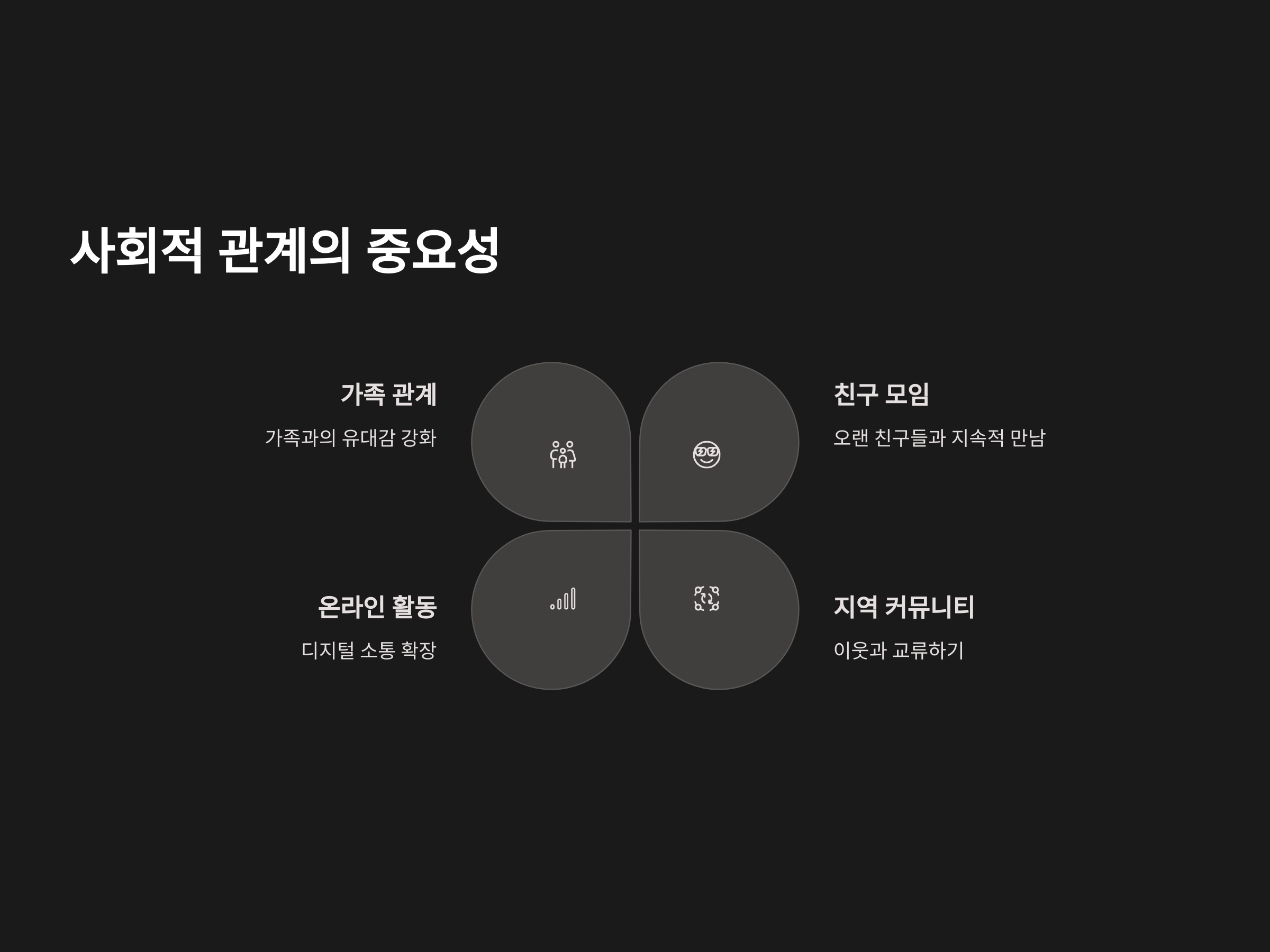 퇴직 후에는 사람들과의 관계를 잘 유지하는 것이 중요합니다. 많은 사람들이 직장 내 인간관계에 의존했지만, 퇴직 후에는 다른 사회적 네트워크를 확장하는 것이 중요합니다. 가족, 친구, 이웃과의 관계를 강화하고, 새로운 사람들과 만날 수 있는 기회를 만들면 외로움을 느낄 일이 줄어듭니다.