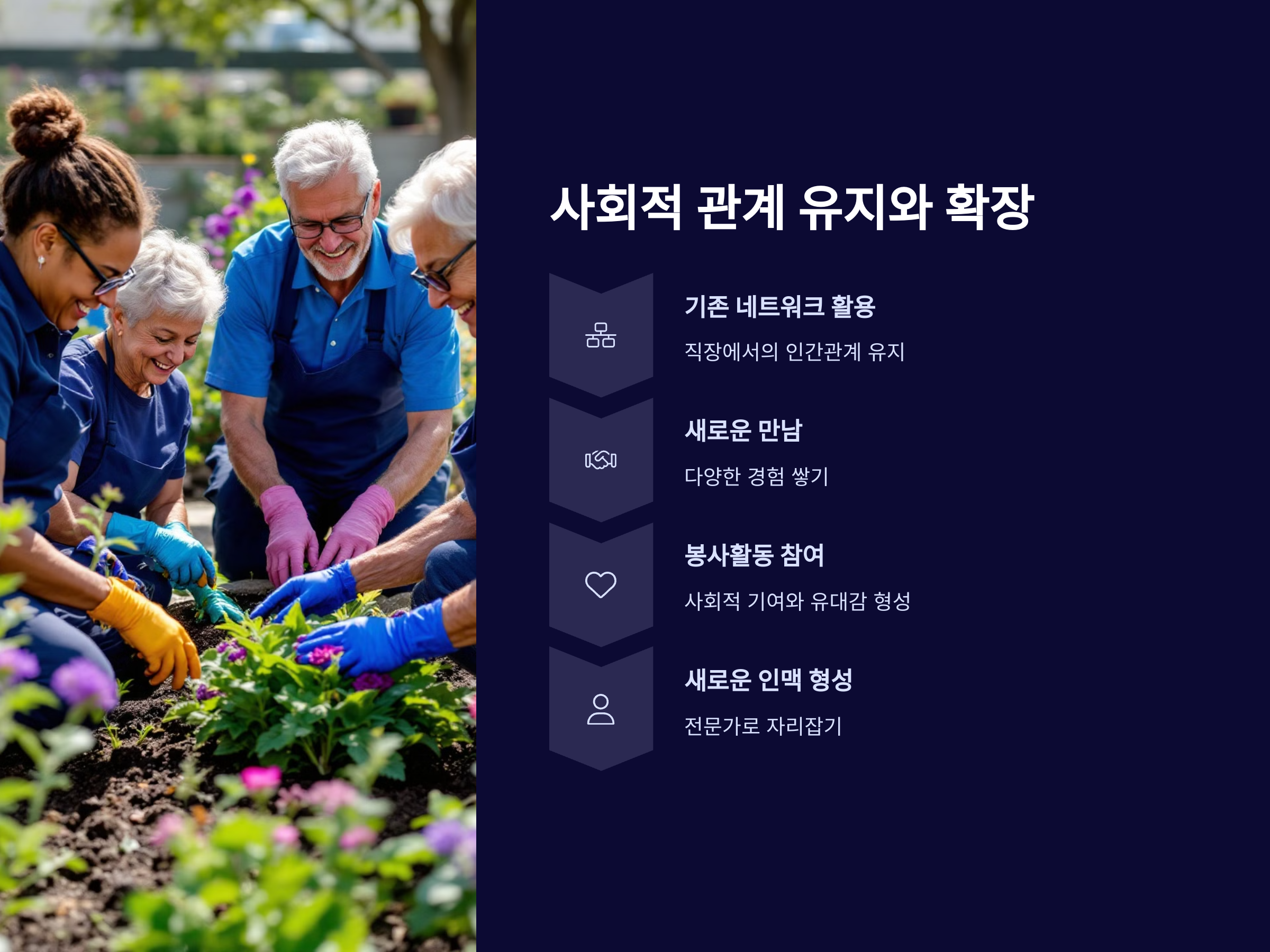 퇴직 후에도 지속적으로 성장하는 사람들의 또 다른 특징은 사회적 관계를 잘 유지하고 확장하는 것입니다. 직장에서의 인간관계와 사회적 네트워크는 퇴직 후에도 큰 도움이 될 수 있습니다. 성장하는 사람들은 이러한 네트워크를 잘 활용하고, 새로운 사람들과의 만남을 통해 다양한 경험을 쌓습니다.