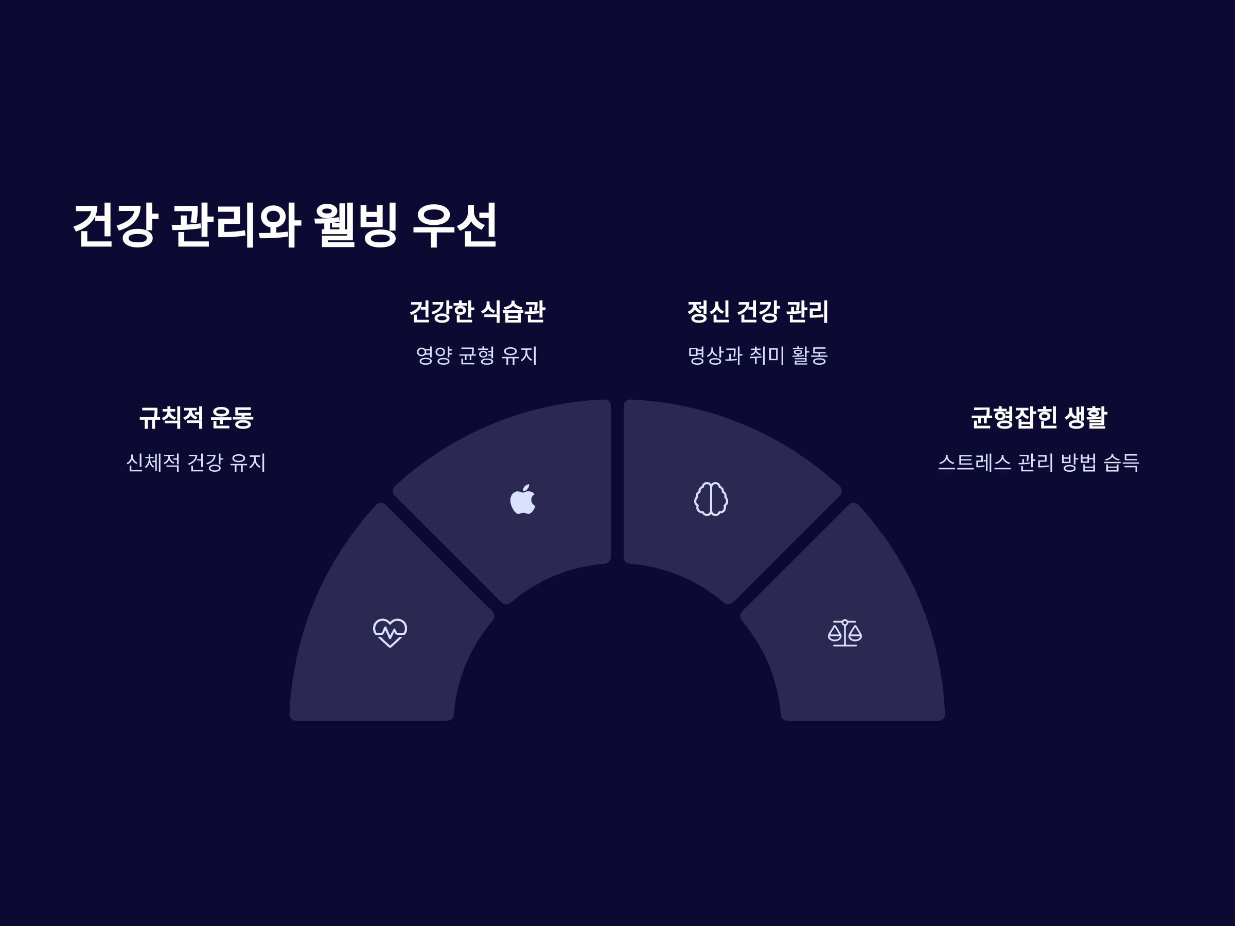 건강한 몸과 마음은 창의력과 생산성을 높이는 데 중요한 역할을 하며, 이를 통해 퇴직 후에도 새로운 도전과 기회를 추구할 수 있는 에너지를 제공합니다. 이들은 자주 운동을 하고, 건강한 식습관을 유지하며, 스트레스를 관리하는 방법을 배워가며 자신만의 균형 잡힌 삶을 추구합니다.