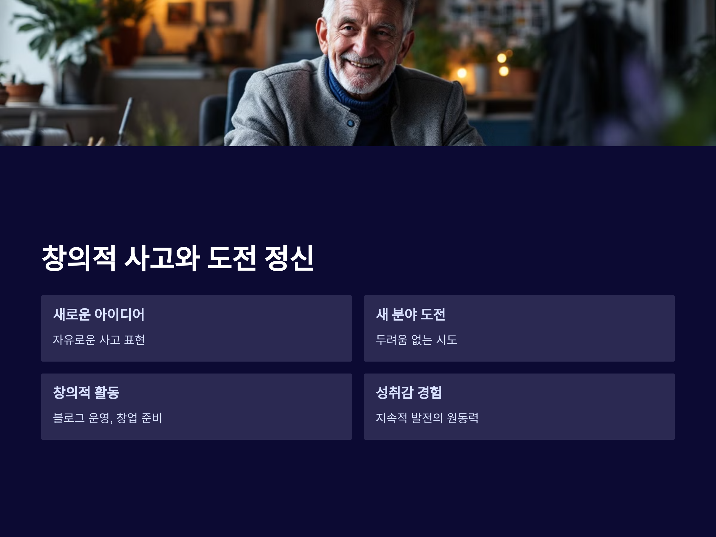 이들은 자신의 생각을 표현하고, 새로운 기술이나 분야에 대한 도전 정신을 가지고 창의적인 활동을 지속적으로 시도합니다. 예를 들어, 블로그를 운영하거나, 창업을 준비하는 등의 도전적인 활동을 통해 성취감을 얻고 성장합니다. 도전 정신과 창의적인 사고는 퇴직 후에도 자신을 끊임없이 발전시키는 원동력이 됩니다.