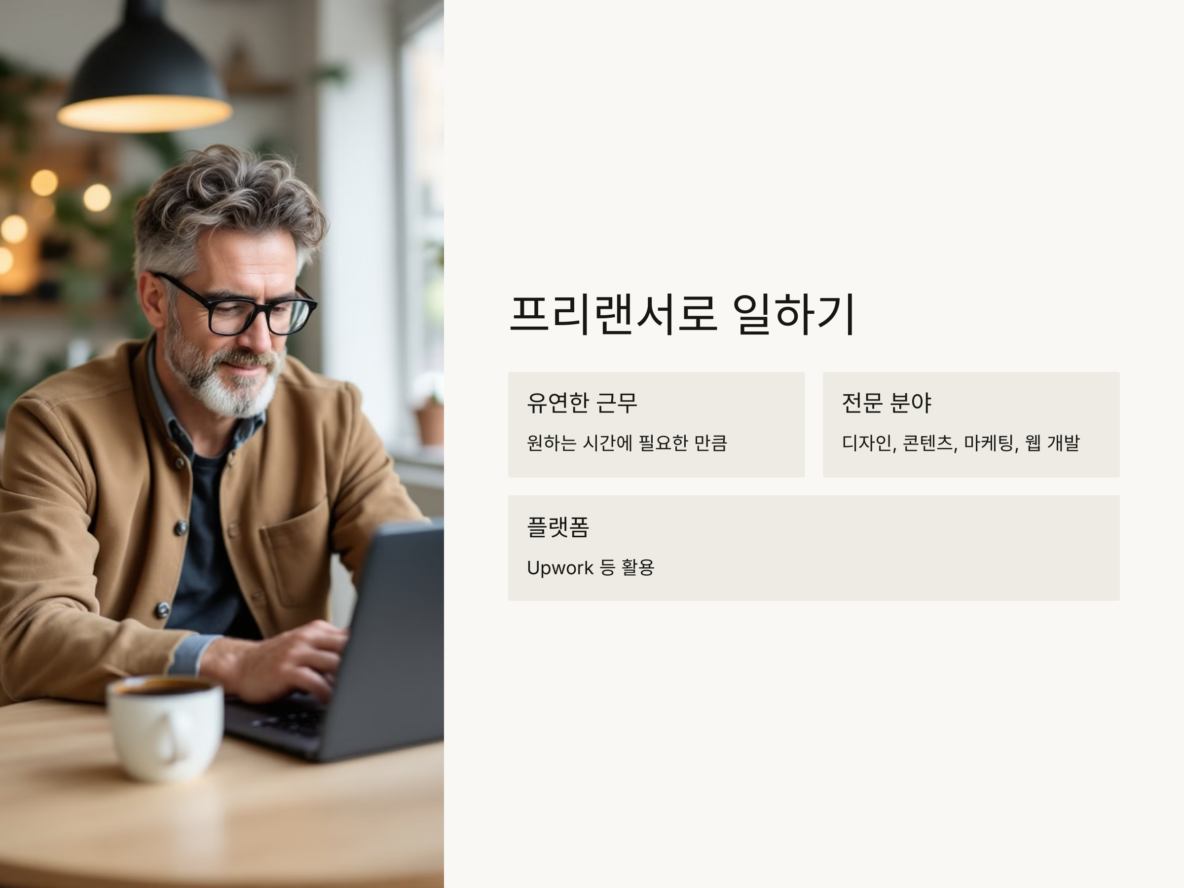 프리랜서는 자신이 원하는 시간에 일을 하며, 필요한 만큼만 일할 수 있기 때문에 퇴직 후에도 수익을 안정적으로 유지할 수 있습니다. 디자인, 콘텐츠 작성, 마케팅, 웹 개발 등 다양한 분야에서 프리랜서로 일할 수 있으며, 이러한 분야는 수요가 지속적으로 증가하고 있습니다.