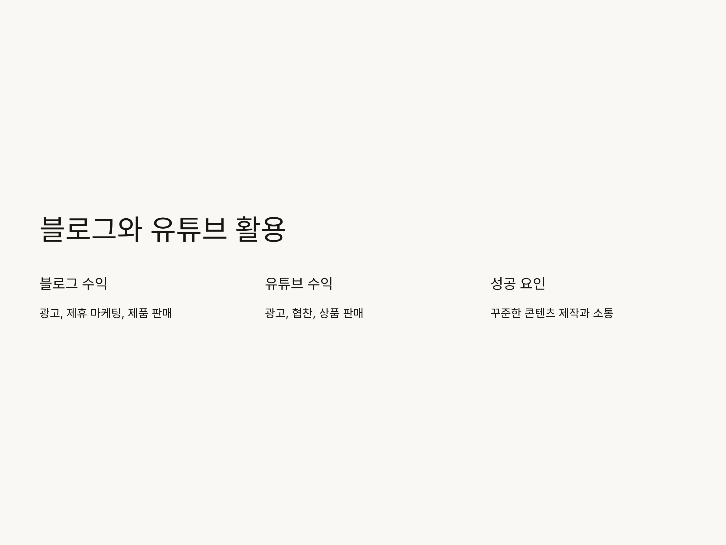 블로그나 유튜브에서 중요한 점은 꾸준한 콘텐츠 제작입니다. 자신이 관심 있는 분야나 전문가로서의 경험을 바탕으로 콘텐츠를 제작하고, 이를 통해 다른 사람들과 소통하는 방법은 점차적으로 수익을 증가시키는 효과적인 방법이 될 수 있습니다.