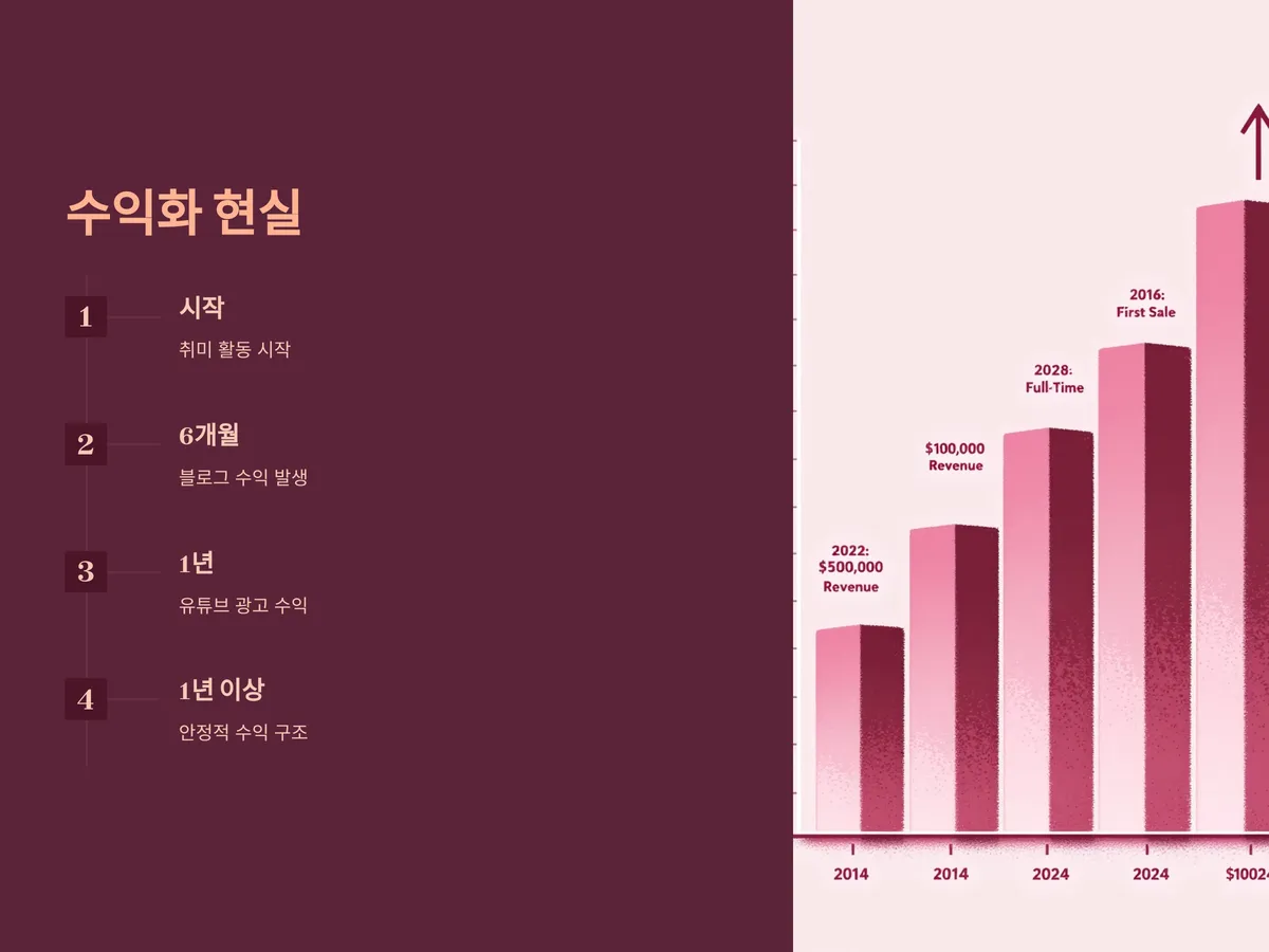 수익이 발생하기까지 인내심이 필요하며, 이 과정에서 꾸준한 콘텐츠 관리, 피드백 반영, SEO 최적화, SNS 연동 마케팅 등을 통해 지속적인 개선이 이루어져야 합니다. 이 시기를 잘 버텨낸 사람만이 취미를 수익으로 연결할 수 있습니다.