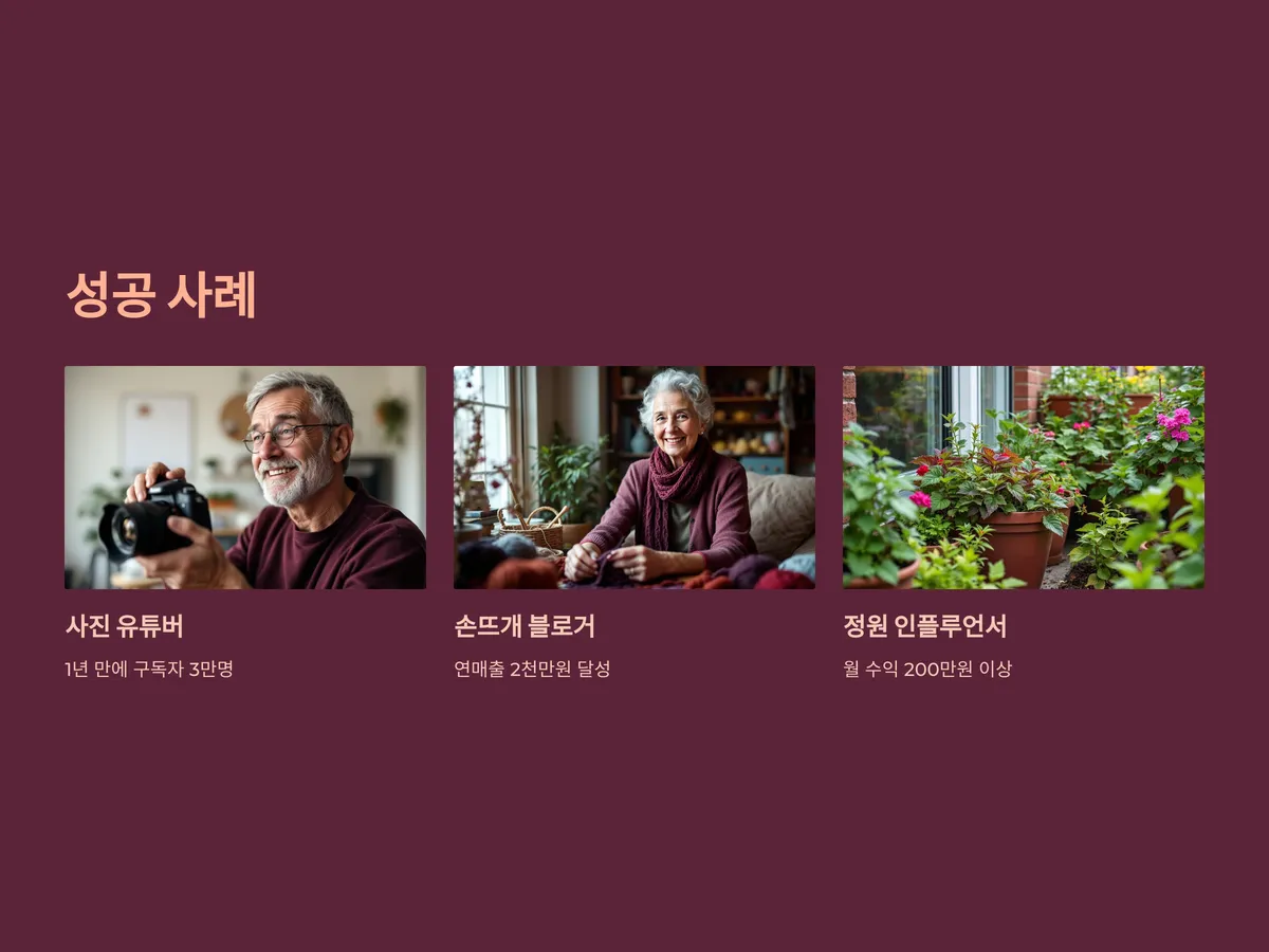 - 정년퇴직 후 사진 유튜버로 성공한 김OO씨: DSLR로 사진을 찍던 취미를 살려 유튜브에 사진촬영 강좌를 올렸고, 1년 만에 구독자 3만 명을 돌파하며 유료 강좌와 출판 계약까지 성사됨.