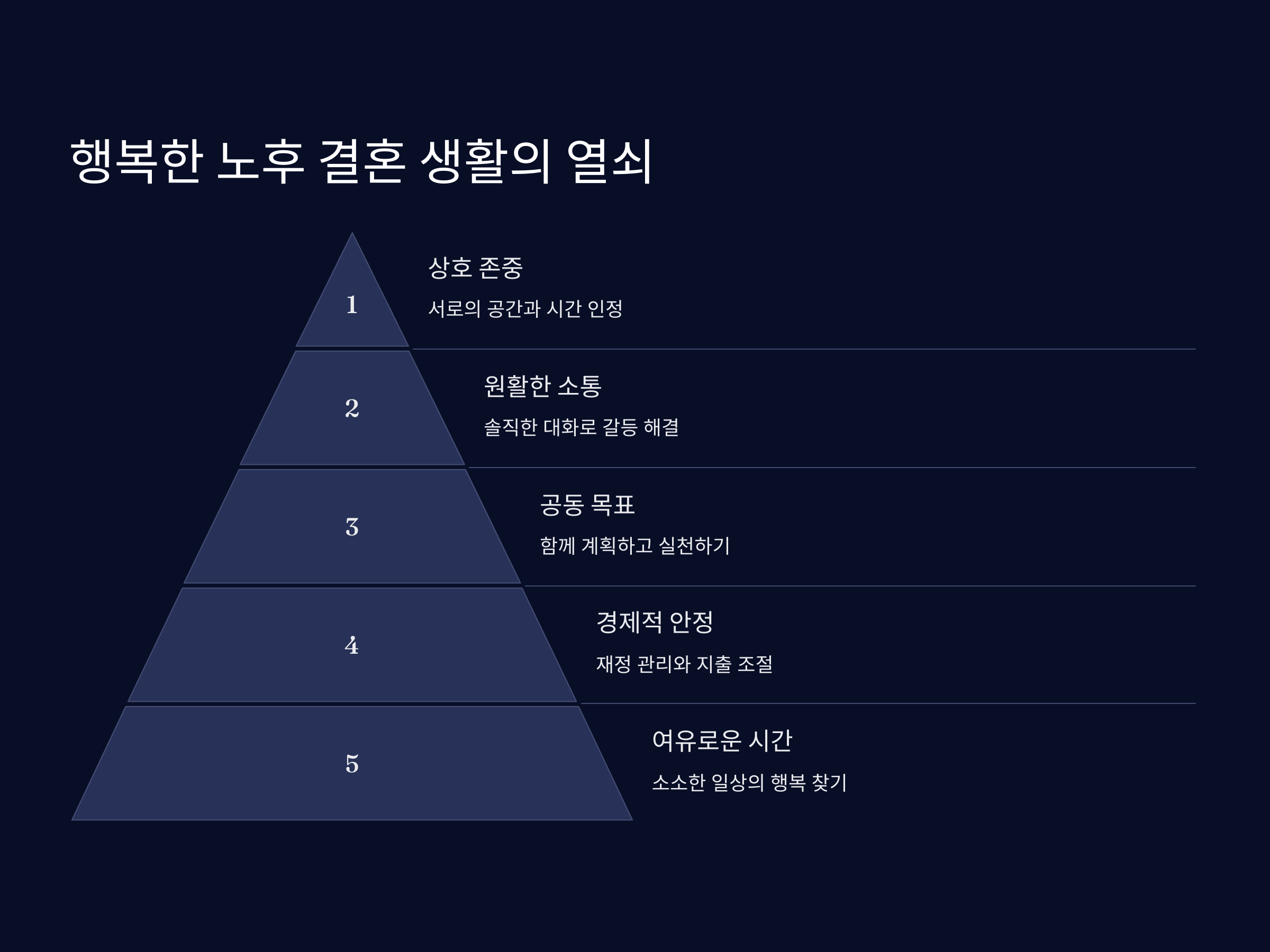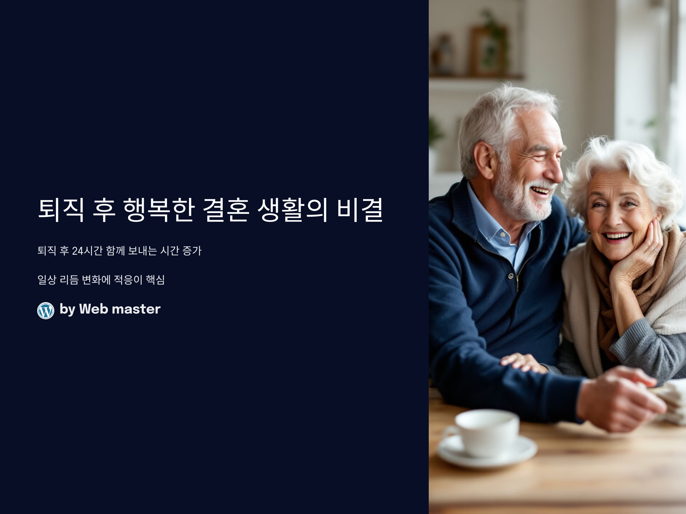 퇴직 후의 삶은 많은 변화를 가져옵니다. 그 변화 속에서 부부가 어떻게 서로를 이해하고 존중하는지에 따라 결혼 생활의 질이 달라질 수 있습니다. 퇴직 후에도 행복한 결혼 생활을 유지하려면, 서로의 시간을 존중하고, 대화와 협력의 자세를 유지하는 것이 가장 중요합니다. 이를 통해 더욱 행복한 미래를 만들어갈 수 있을 것입니다.