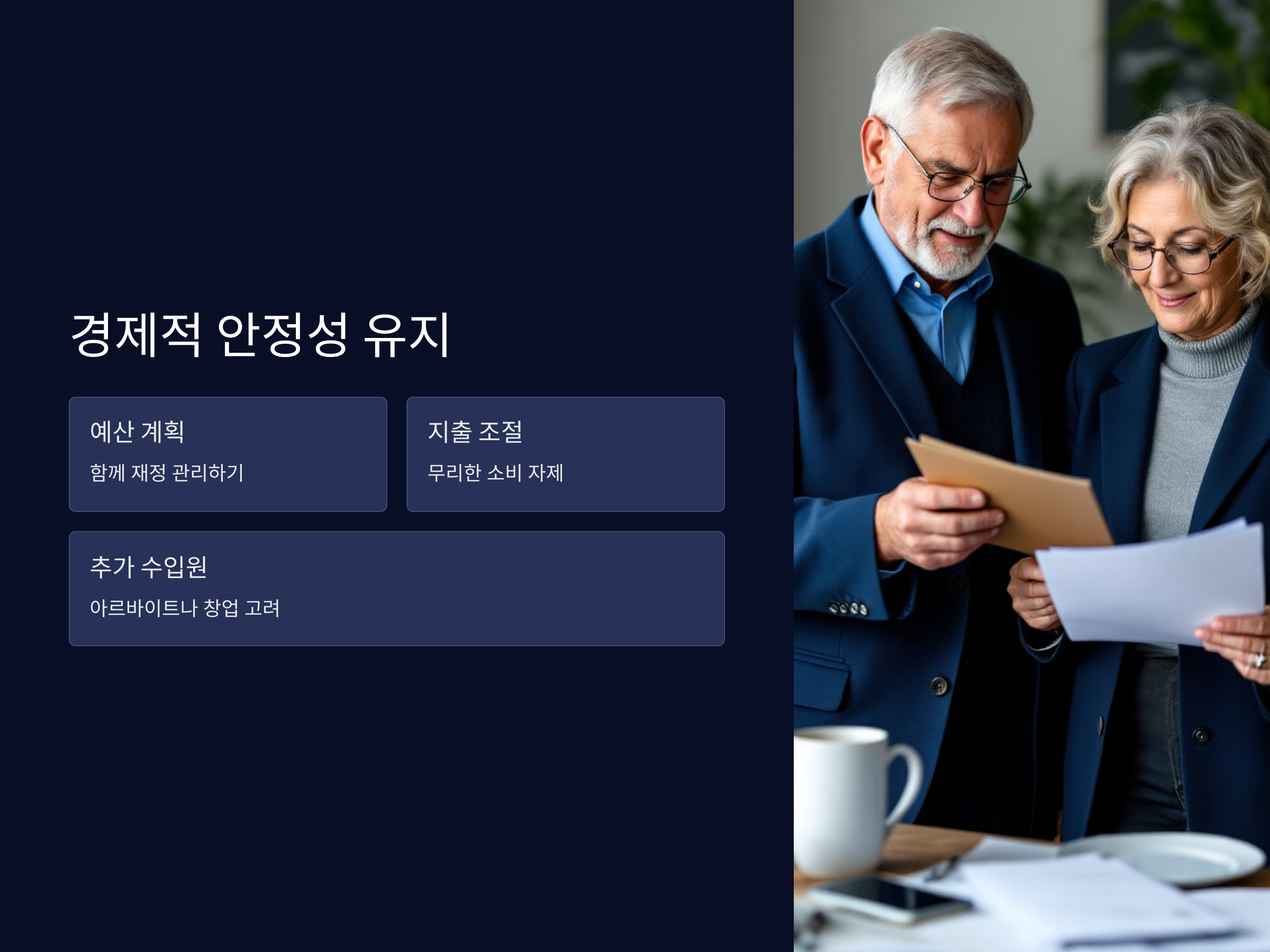 또한, 재정적으로 안정된 삶을 유지하기 위해서는 부부 간의 예산 계획을 함께 세우고, 무리한 지출을 자제하는 것도 필요합니다. 경제적인 어려움이 부부 간의 갈등을 초래할 수 있기 때문에, 퇴직 후에도 경제적인 안정성을 확보하는 것이 매우 중요합니다.