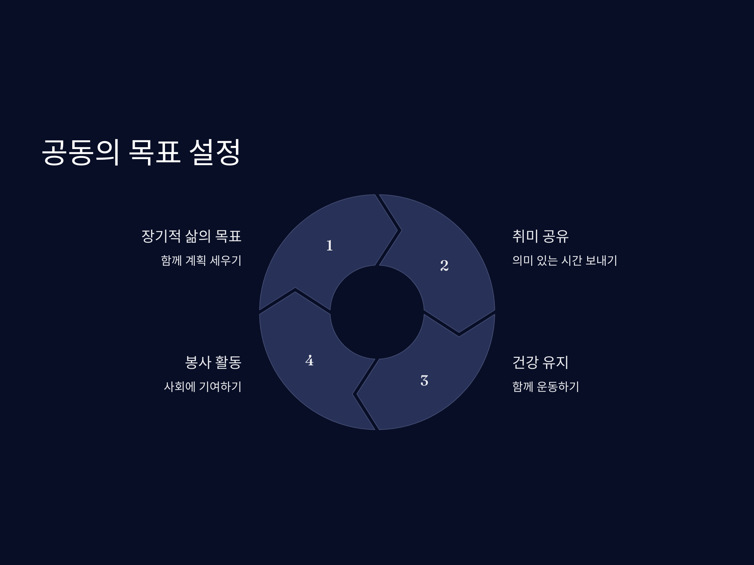 퇴직 후에는 일상의 루틴이 바뀌기 때문에, 부부가 함께 공유하는 목표를 설정하는 것이 중요합니다. 이것은 단순히 "여행을 간다"는 등의 짧은 목표가 아니라, 장기적인 삶의 목표를 의미합니다. 예를 들어, 함께 취미를 시작하거나 봉사 활동을 하며 의미 있는 시간을 보내는 것, 혹은 퇴직 후에도 꾸준히 건강을 유지하기 위한 계획을 세우는 것 등이 있을 수 있습니다.