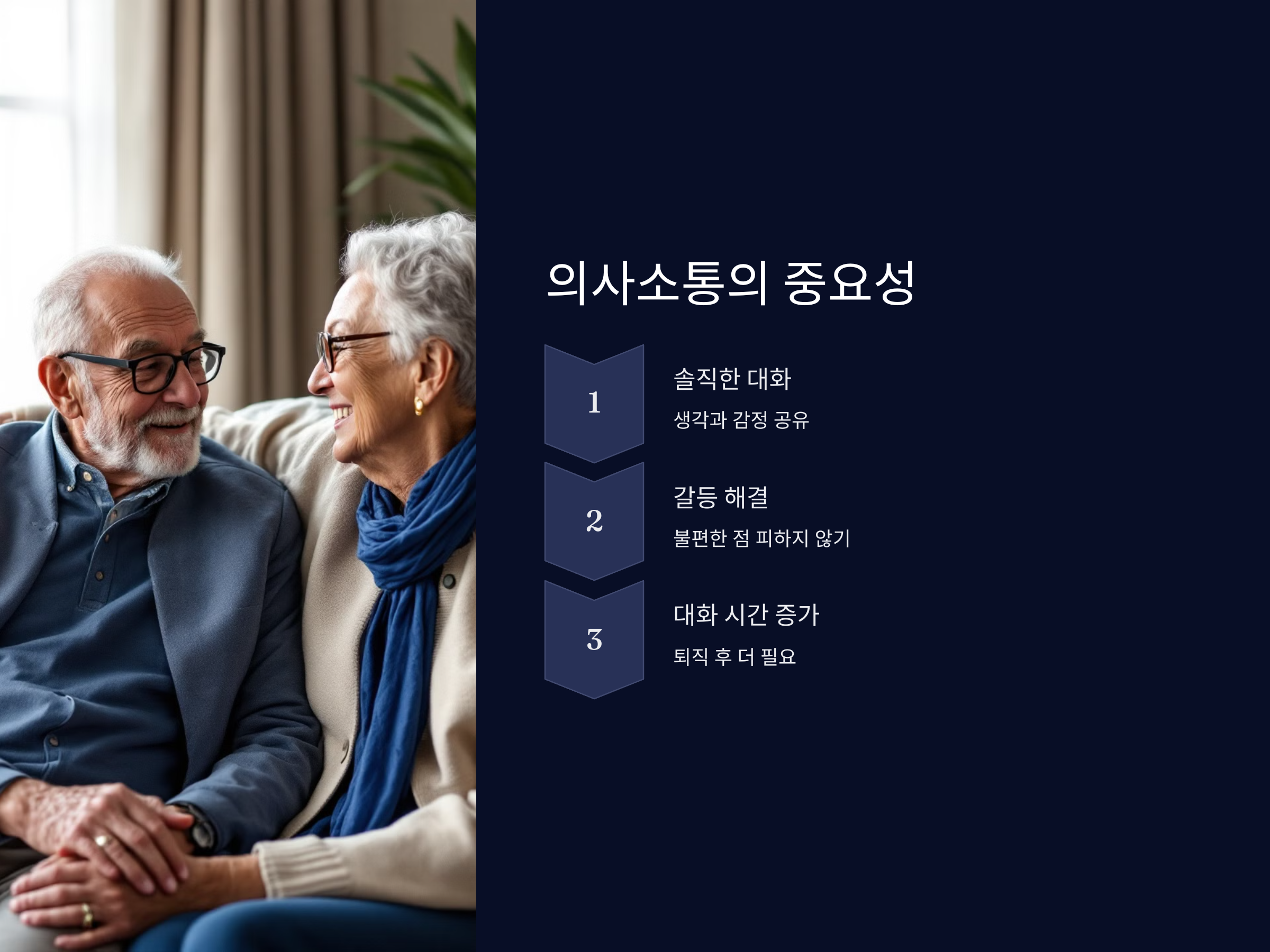 퇴직 후에는 직장에서의 스트레스가 없어지면서, 상대방과 더 많은 시간을 보내게 되지만, 때로는 오히려 더 많은 갈등이 발생할 수 있습니다. 이때 가장 중요한 것은 바로 의사소통입니다. 서로의 생각을 존중하고 솔직하게 대화를 나누는 것이 무엇보다 중요합니다.