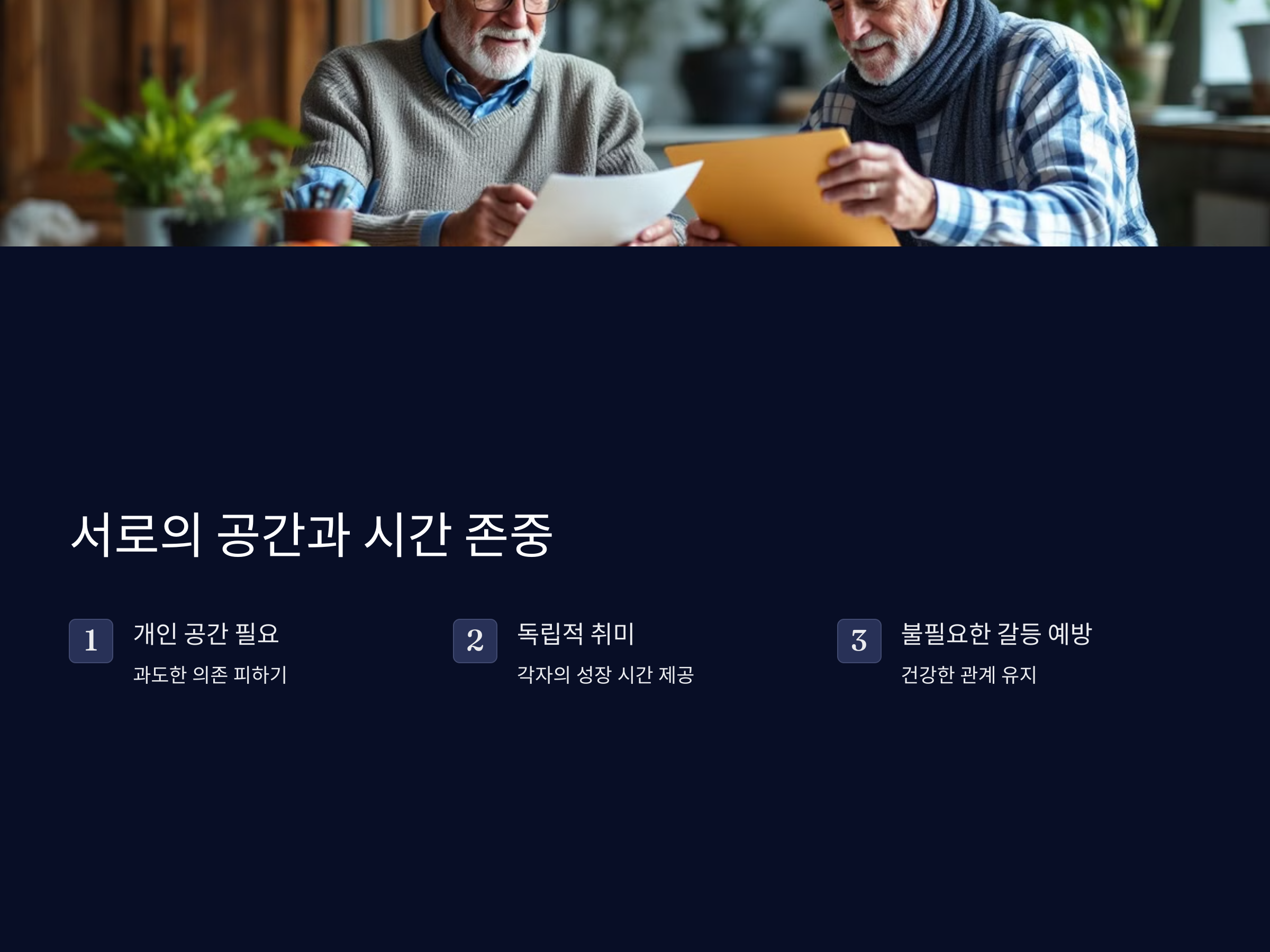 퇴직 후에는 하루 종일 집에 있는 시간이 많아지기 때문에, 서로의 개인적인 공간을 존중하는 것이 필수적입니다. 부부가 함께 하는 시간이 많아지면, 자칫 서로에게 지나치게 의존하게 될 수 있습니다. 그러나 오히려 각자의 공간과 시간을 존중해 주는 것이 관계를 더 건강하게 만듭니다.