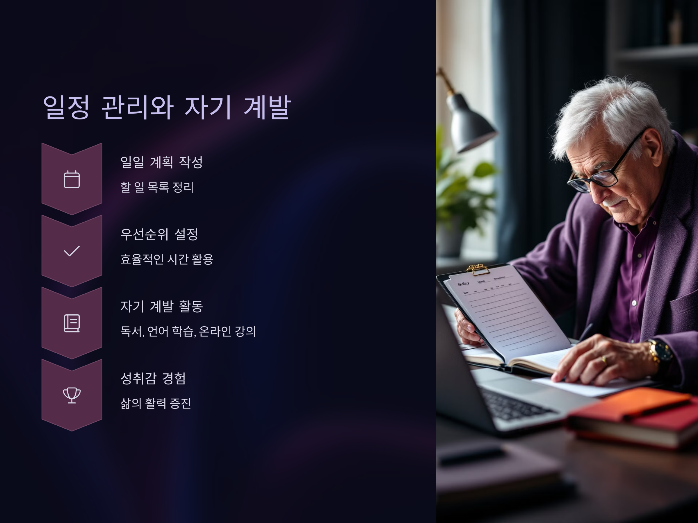 이러한 습관은 정신적 만족감도 제공합니다. 할 일이 완료될 때마다 성취감을 느낄 수 있기 때문에, 일정 관리가 퇴직 후의 삶에 활력을 더하는 중요한 요소로 작용합니다. 또한, 자기 계발을 위한 책 읽기, 새로운 언어 배우기, 온라인 강의를 듣는 등 자신을 계속 발전시켜 나가려는 노력이 중요합니다. 이는 퇴직 후에도 계속해서 삶에 활력을 불어넣어 주는 원동력이 됩니다.
